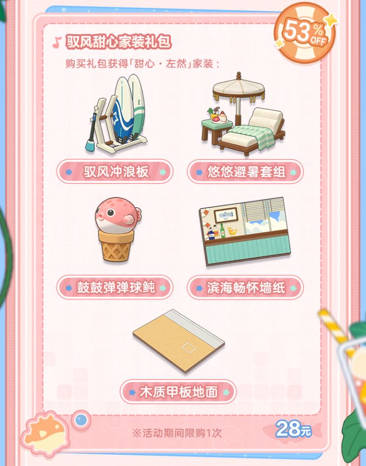 -礼包内容:驭风冲浪板、悠悠避暑套组、鼓鼓弹弹球鲀、滨海畅怀墙纸、木质甲板地面