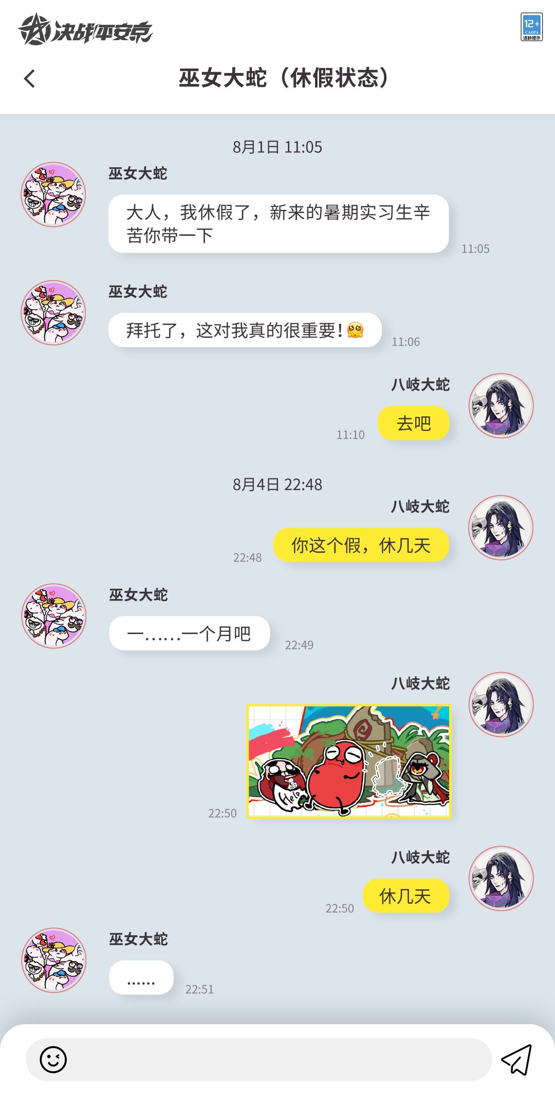 简直一整个实习生整顿“职场”,究竟发生了什么……?樱子太难了,实在很难三言两语向各位阴阳师大人们解释!(递上手机)大人们亲自看看就明白了(T▽T) 8月1日维护后-8月28日,《决战!平安京》×贪吃蛇大作战联动活动现已开启!欢迎大人们发挥脑洞,一起创作蛇蛇实习期间与各位崽崽们发生的趣味故事吧~创作形式不限,Q版表情包、捡手机文学、贪吃大蛇击杀集锦等形式均可,樱子将随机翻牌送出【式神随机周边】等奖励哦!