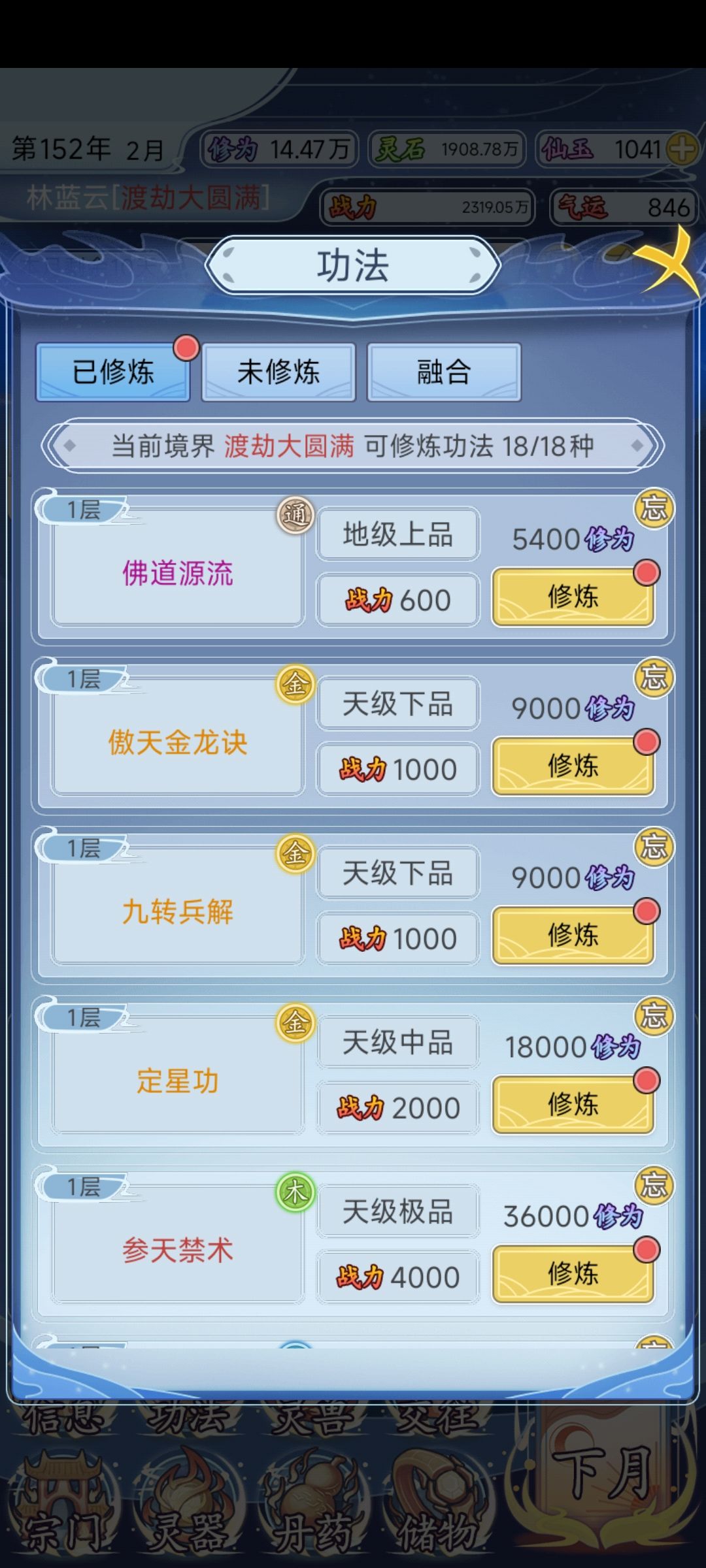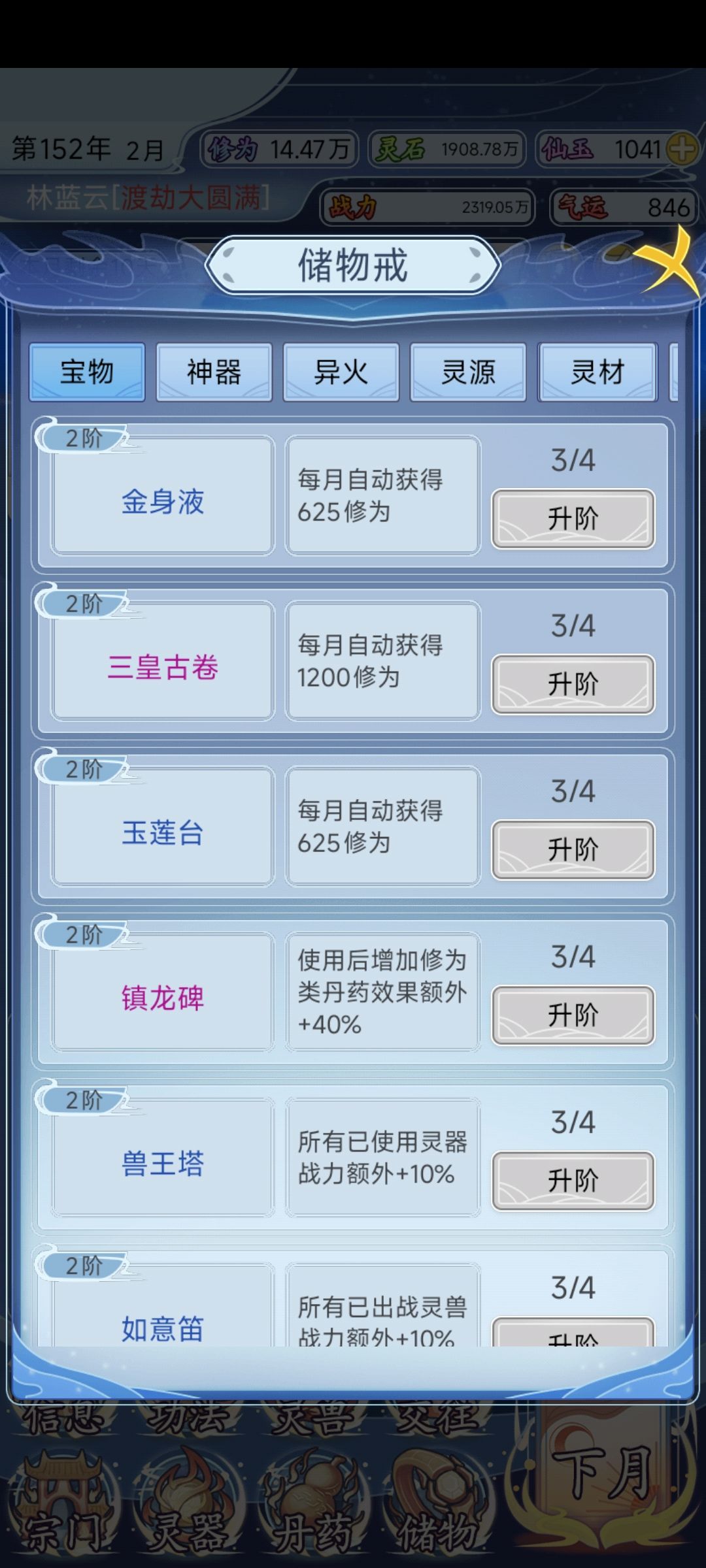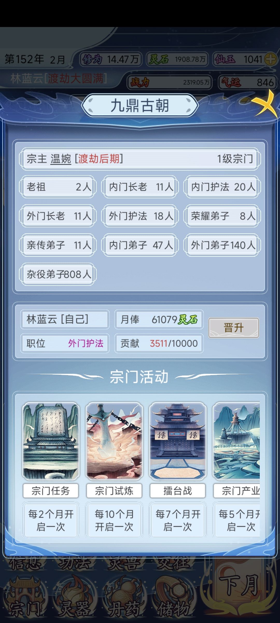 3:宗门,宗门前期有点就点一下,后面点不到的,因为提供的贡献不高,我一直有点任务,修为都渡劫了,贡献只能到外门护法,所以可以考虑不点。