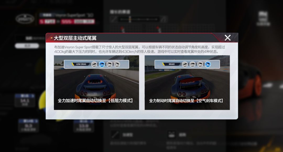 同时在游戏中也可以实时查看尾翼所处的4种状态哦~这种对空气动力学的极致追求,让布加迪 Veyron Super Sport '10 在赛道上更加如鱼得水!