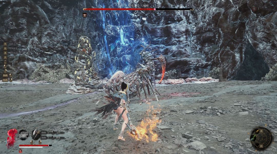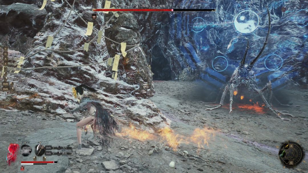 大蚰蜒上身直立身后出现蓝色法阵时我们尽快和它拉开距离,可以一直奔跑也可以站在石柱后面躲避它法阵发射出来的蓝色光柱。