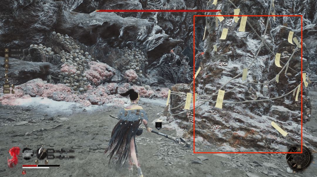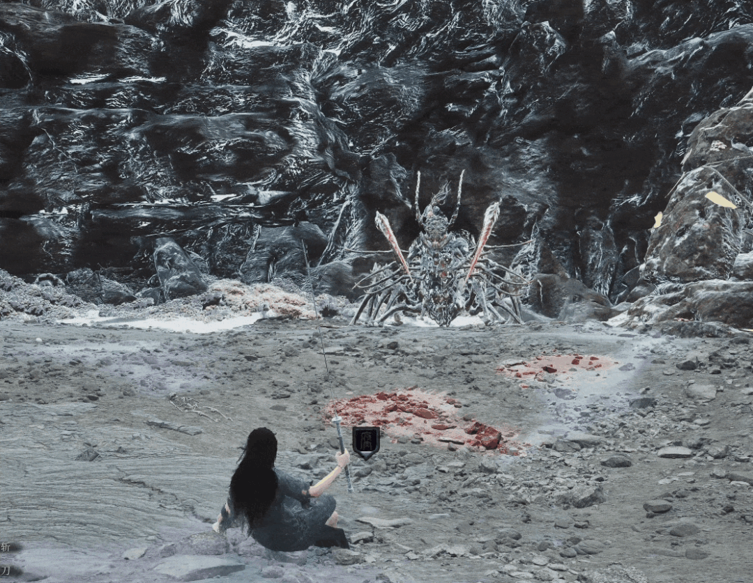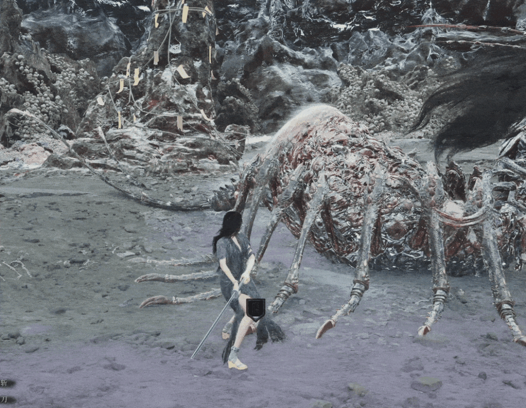 地图中有许多这种带有符纸的石柱,用这种石柱与大蚰蜒拉开距离使石柱位于无常和大蚰蜒的中间,当BOSS出手攻击无常时会攻击到柱子将自己击晕,我们可以趁机上前蓄力攻击打出破刹效果。