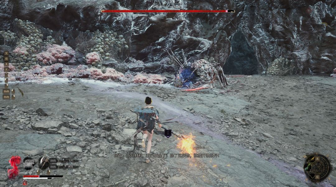 当地上出现红色标识时按下闪避键就可以躲避,灵活利用石柱和闪避破土攻击来将其击败。