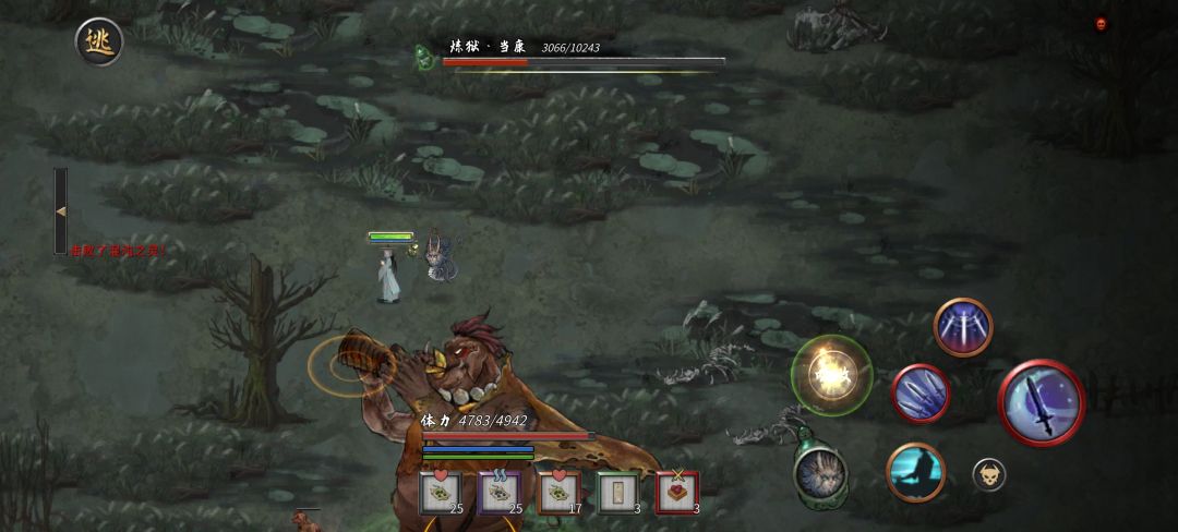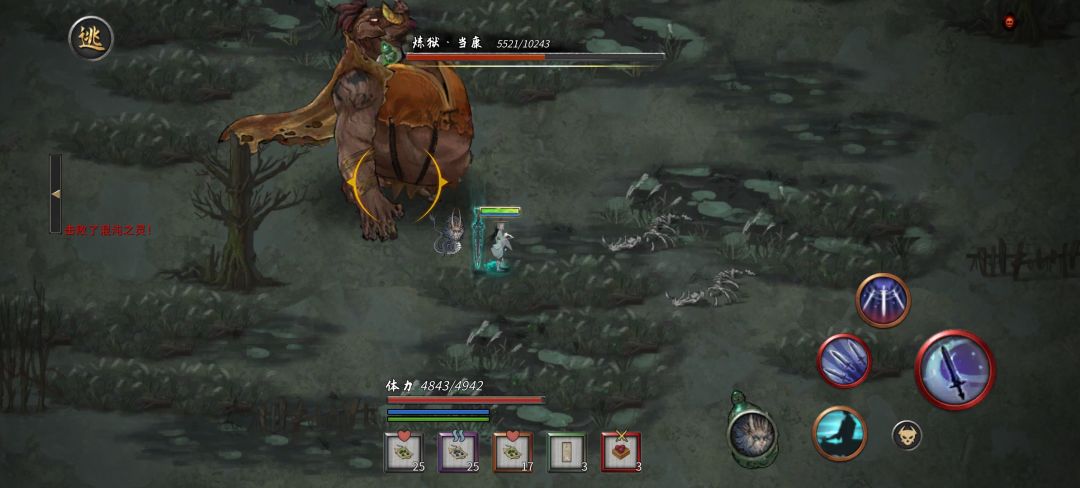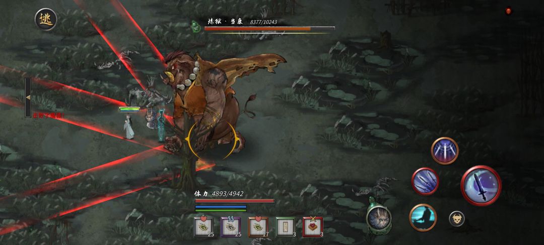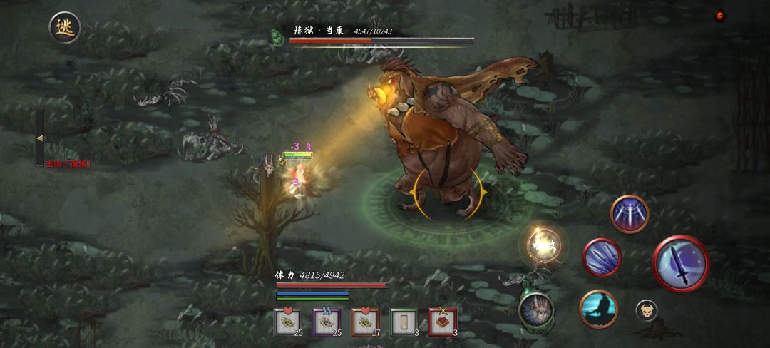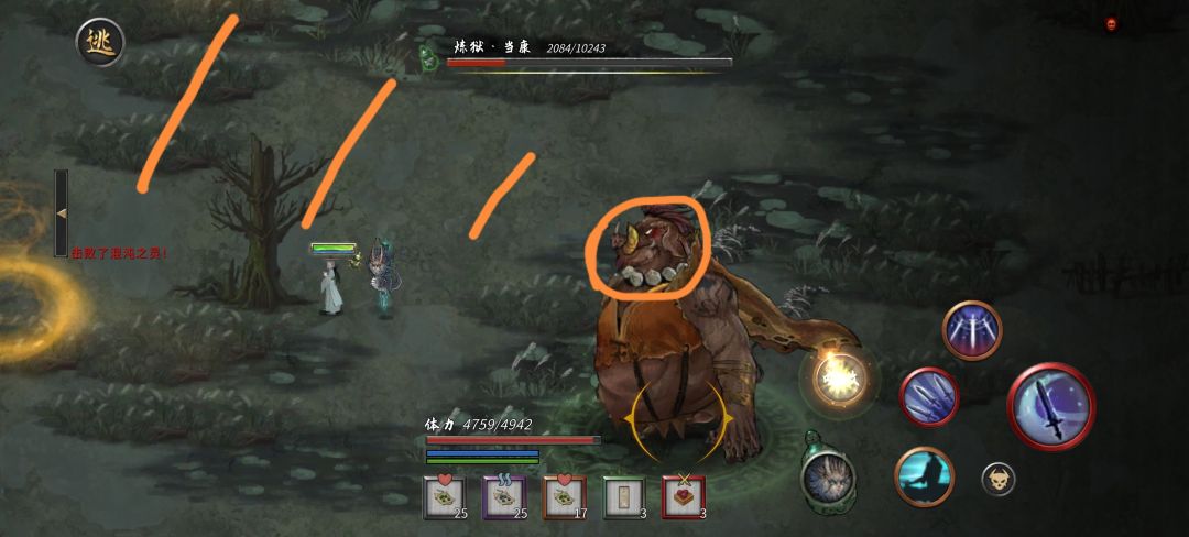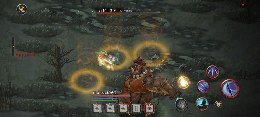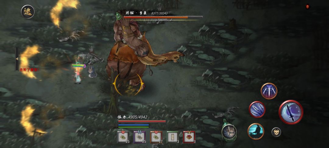 接着就考验玩家的眼力了,看到当康抬手,这时候便需要靠后一点放技能攻击,同时要注意摇杆控制,上下略微移动便可躲过(移动多了会GG);看到当康抬头,就放控制类技能打断(或者用迅雷符跑路)(火身法和风身法也可以)。有条件的放凶卫符或者灵兽吸引火力,看到当康吹号角就靠近它贴脸释放技能灌伤。慢慢磨血直到当康死亡。