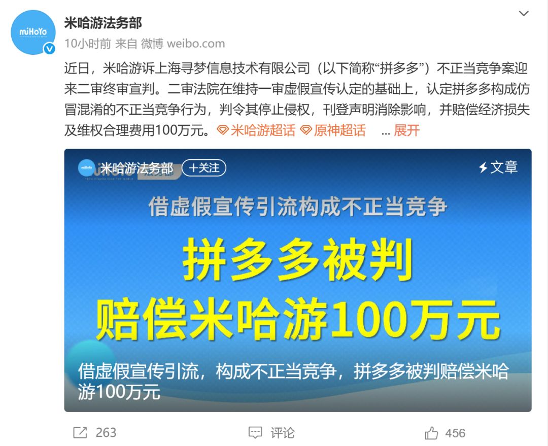 米哈游法务再发威!拼多多“1元买原石”虚假宣传被判百万赔偿