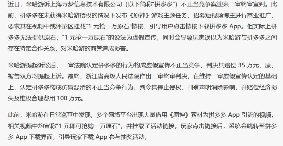 浙江省高级人民法院终审判决拼多多(上海寻梦公司)因虚假宣传+攀附《原神》IP构成不正当竞争,需立即停止侵权、在《中国知识产权报》刊登道歉声明,并赔偿米哈游100万元。