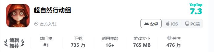 2025年1月23日,《超自然行动组》改名并正式上线移动端和PC端,目前TapTap下载共计735万,安卓热榜第一,力压众多游戏,并在7月26号实现游戏单日在线破百万。
