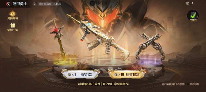 总结:这个双管一定要抽,强度不低(因人而异,如果你感觉不行当我没说),其次音效卡可以拿,至于主武器抽一定次数一定会有的不用再换,近战看情况,有条件自然全拿下有无所谓,没条件不拿也没事,帝皇边款(人物框)也没有多好看。