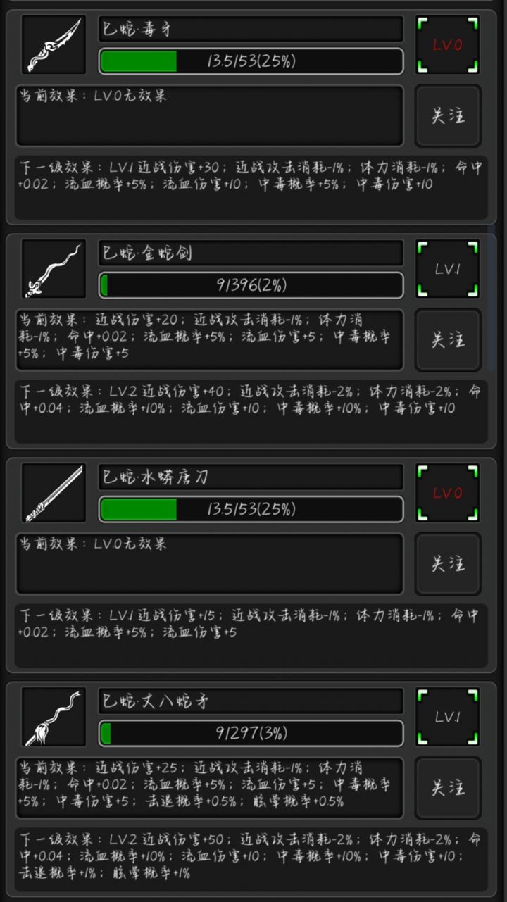 近战伤害+20*熟练度等级;近战攻击消耗-1%*熟练度等级;体力消耗-2%*熟练度等级;命中+0.02*熟练度等级;中毒概率+5%*熟练度等级;中毒伤害+5*熟练度等级;击退概率+0.5%*熟练度等级;眩晕概率+0.5%*熟练度等级