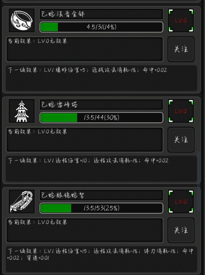 远程伤害+25*熟练度等级;远程攻击消耗-1%*熟练度等级;命中+0.02*熟练度等级;穿透+0.01*熟练度等级