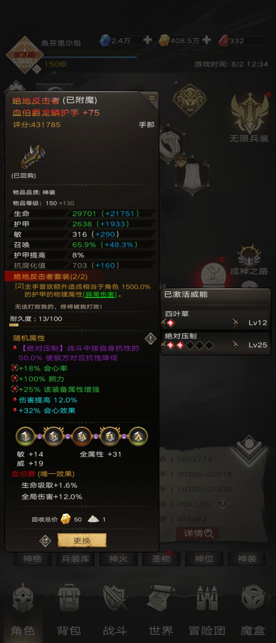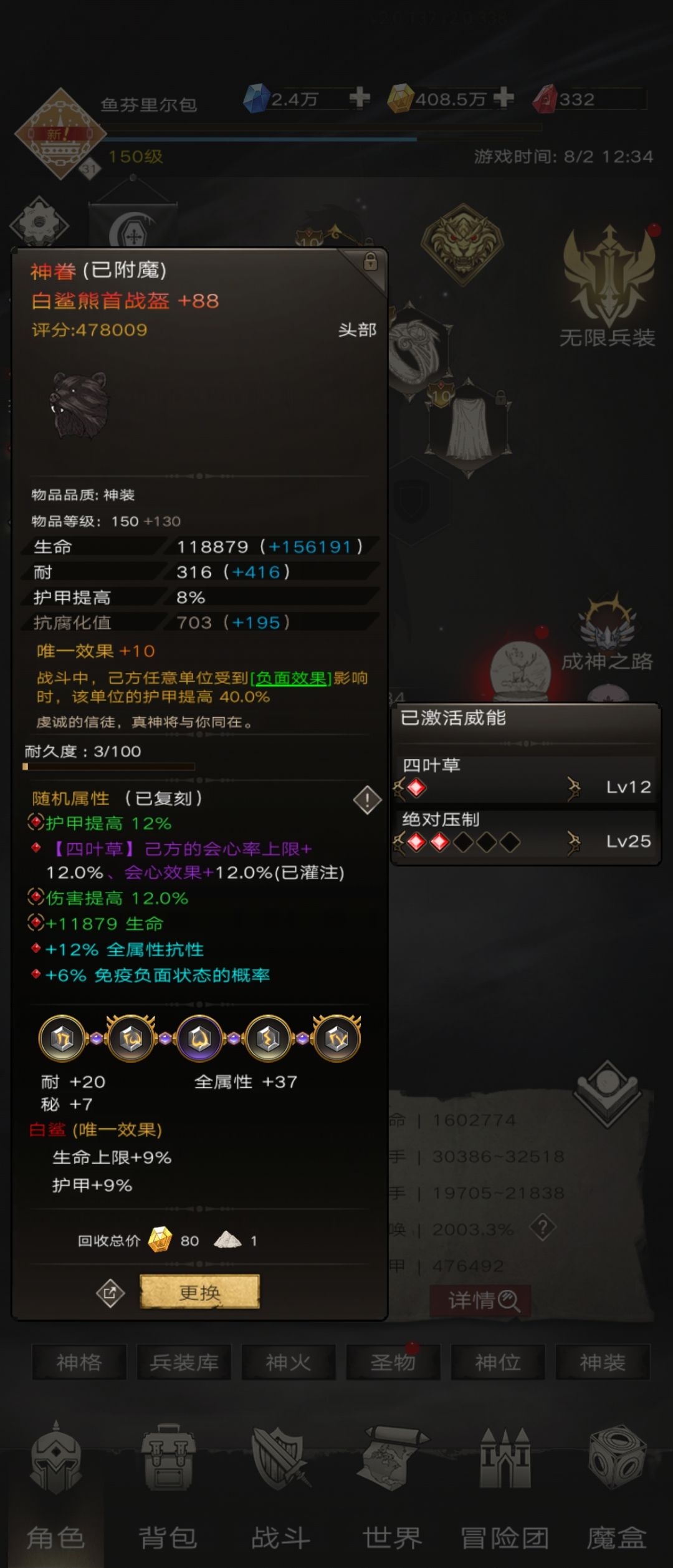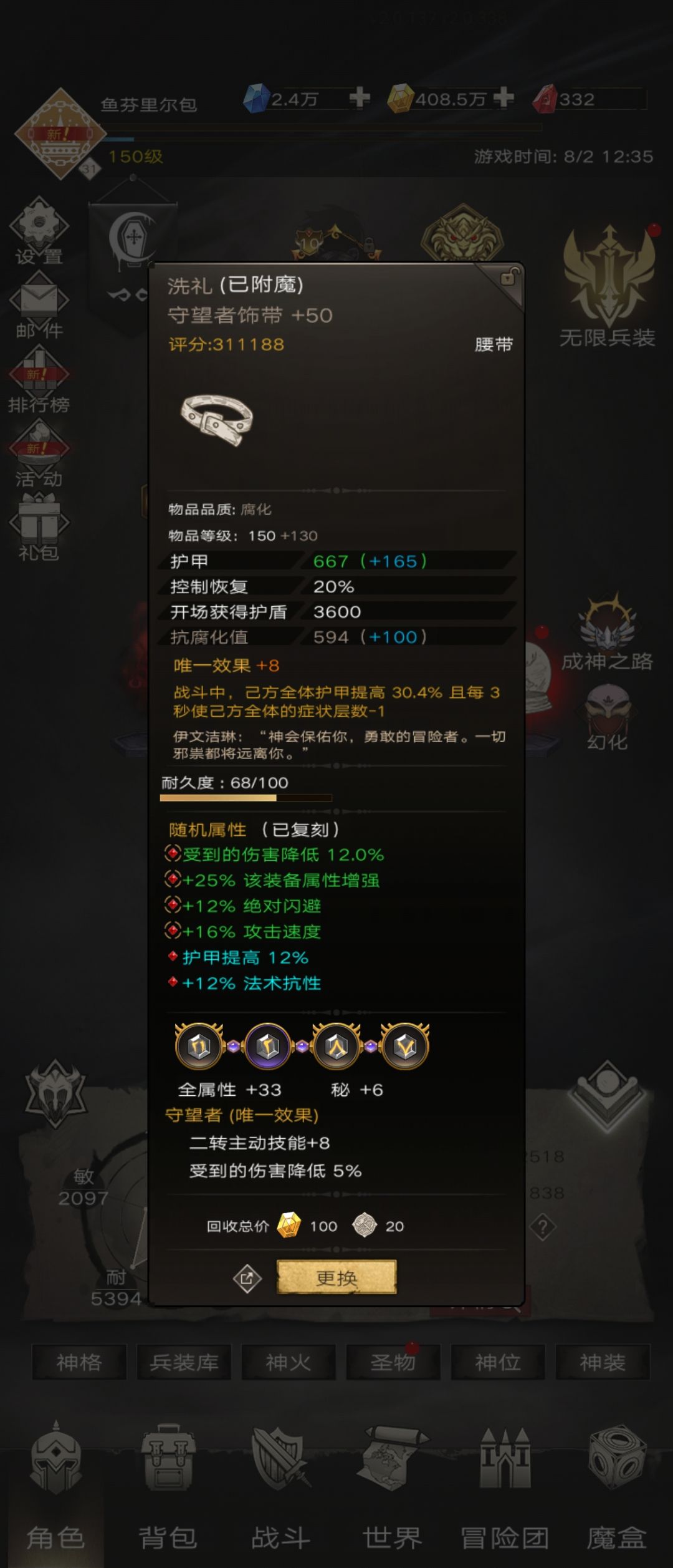 这里带圣域是因为我这号目前只异化了一个圣域 他有个15%护甲增幅还能用用。如果有更好的也可以换成更好了,圣域这东西老牛不改就是纯飞舞玩意,护甲兵装这辈子都用不上这个。圣盾buff刚出直接秒没,护甲效果全程覆盖率不超过20%只能说。满神性也只有30%获得圣盾概率,一个概率又低,触发之后秒没的护甲增幅效果和没有一样。要是有高星级可以换成暴虐这种增伤多的。
