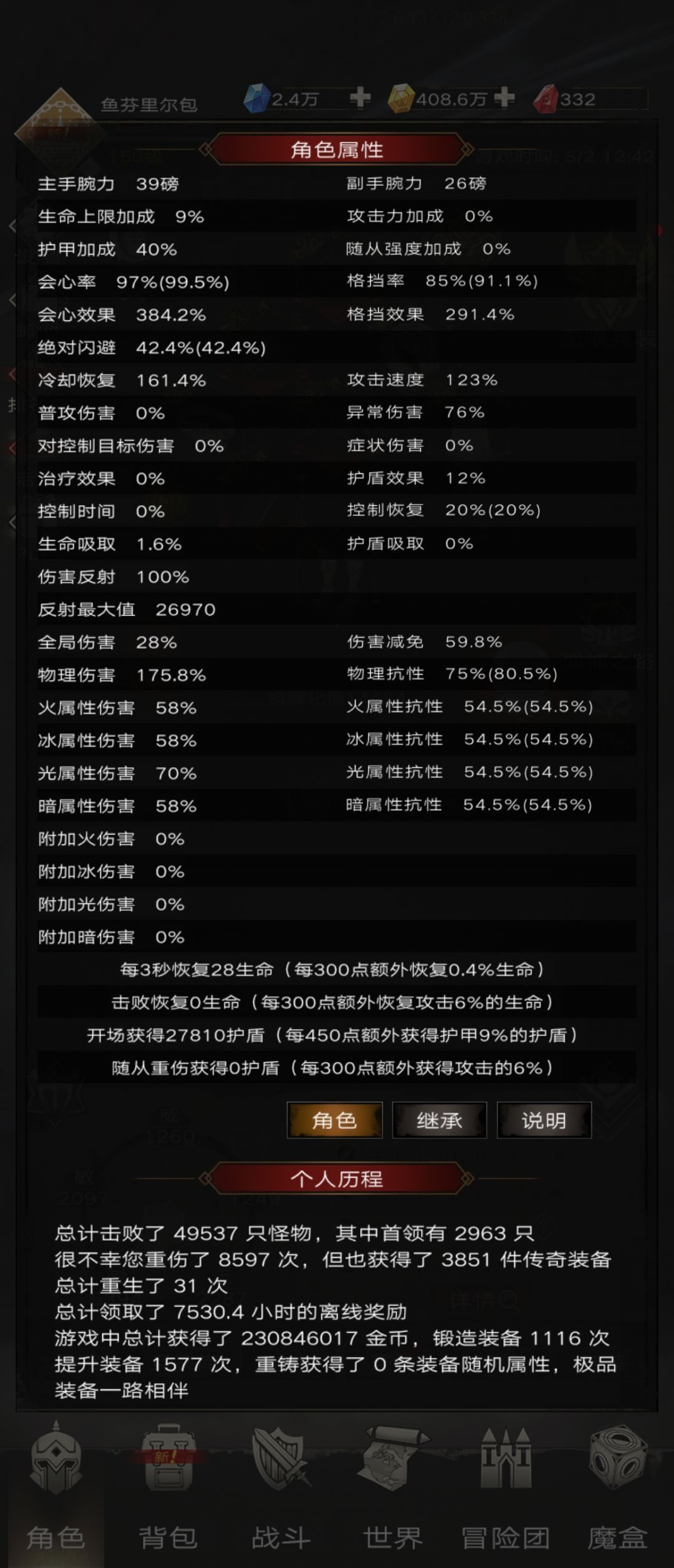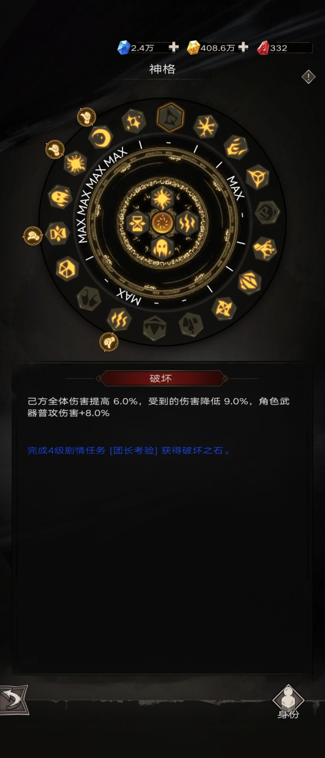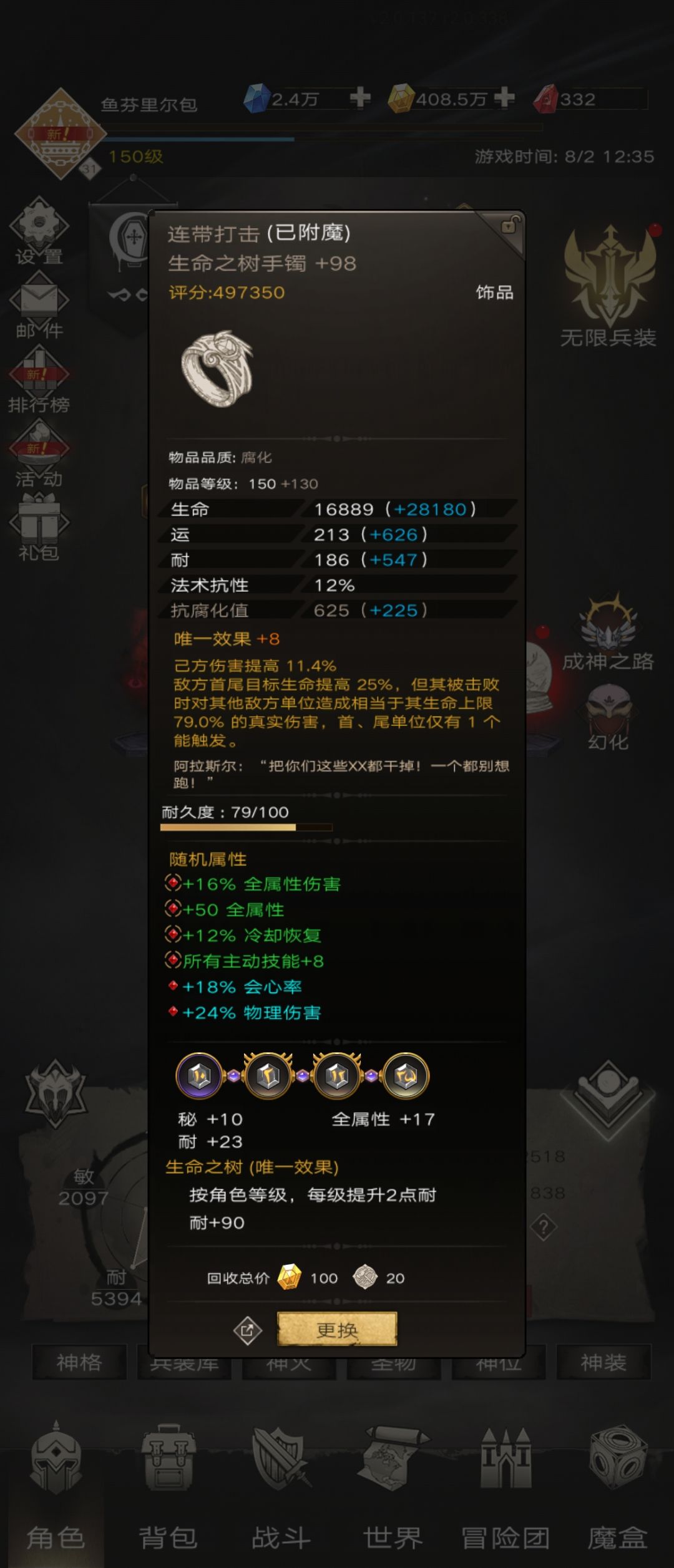 这里带圣域是因为我这号目前只异化了一个圣域 他有个15%护甲增幅还能用用。如果有更好的也可以换成更好了,圣域这东西老牛不改就是纯飞舞玩意,护甲兵装这辈子都用不上这个。圣盾buff刚出直接秒没,护甲效果全程覆盖率不超过20%只能说。满神性也只有30%获得圣盾概率,一个概率又低,触发之后秒没的护甲增幅效果和没有一样。要是有高星级可以换成暴虐这种增伤多的。