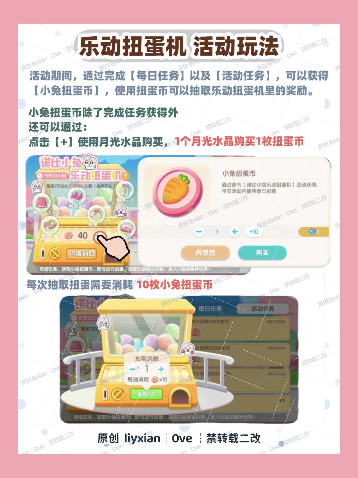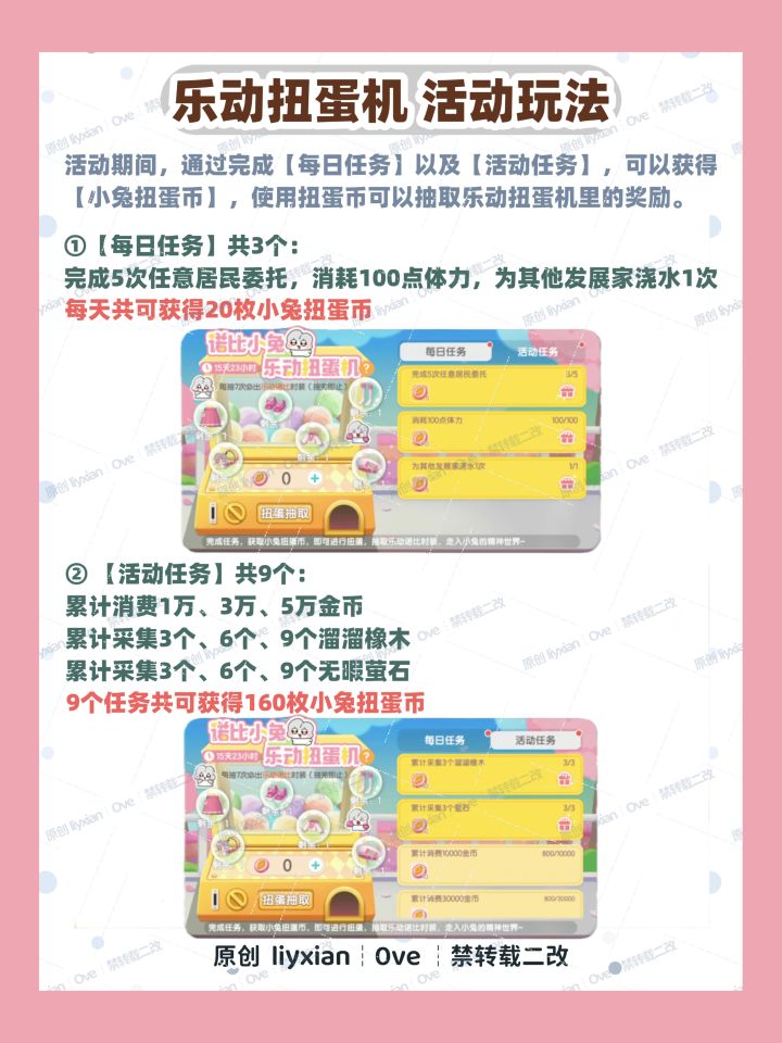 活动期间,通过完成【每日任务】以及【活动任务】,可以获得【小兔扭蛋币】,使用扭蛋币可以抽取乐动扭蛋机里的奖励(乐动诺比套装以及其他道具奖励)。