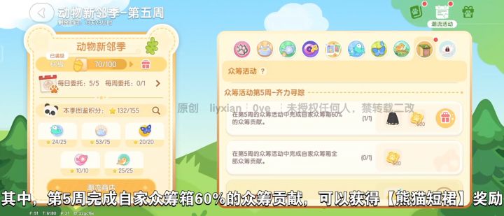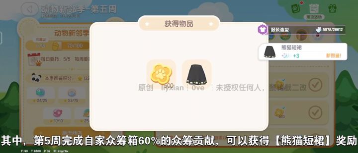 第5周完成自家众筹箱60%的众筹贡献,可以获得【熊猫短裙】奖励。