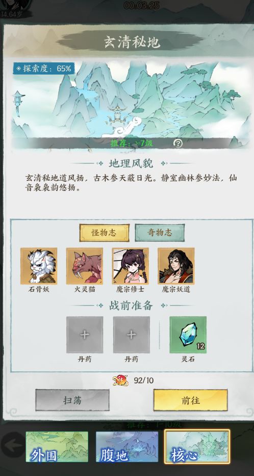 扫荡需要先通关一次该地图才可以使用,进入地图之前可以调整携带的丹药和灵石来辅助战斗,如下图