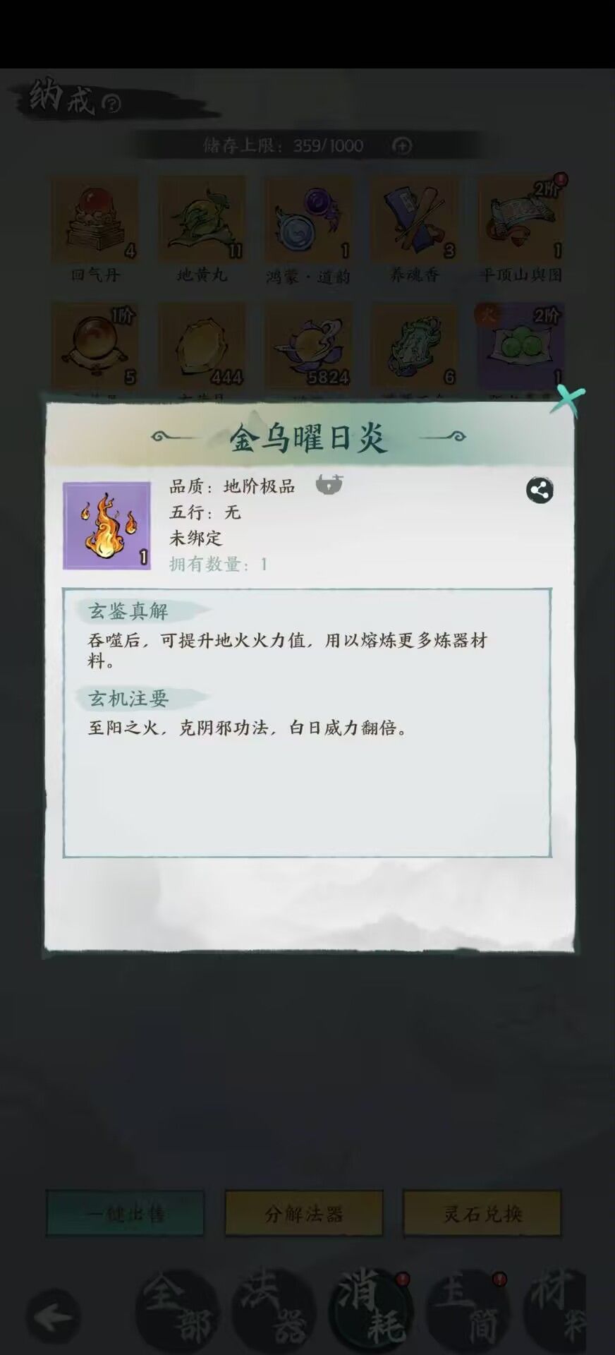 储物袋:有地阶和天阶储物袋,分别能开出对应物品。扫荡只能扫出紫色的地阶储物袋,下图是天阶储物袋,是31级(元婴)飞升后的副本产物