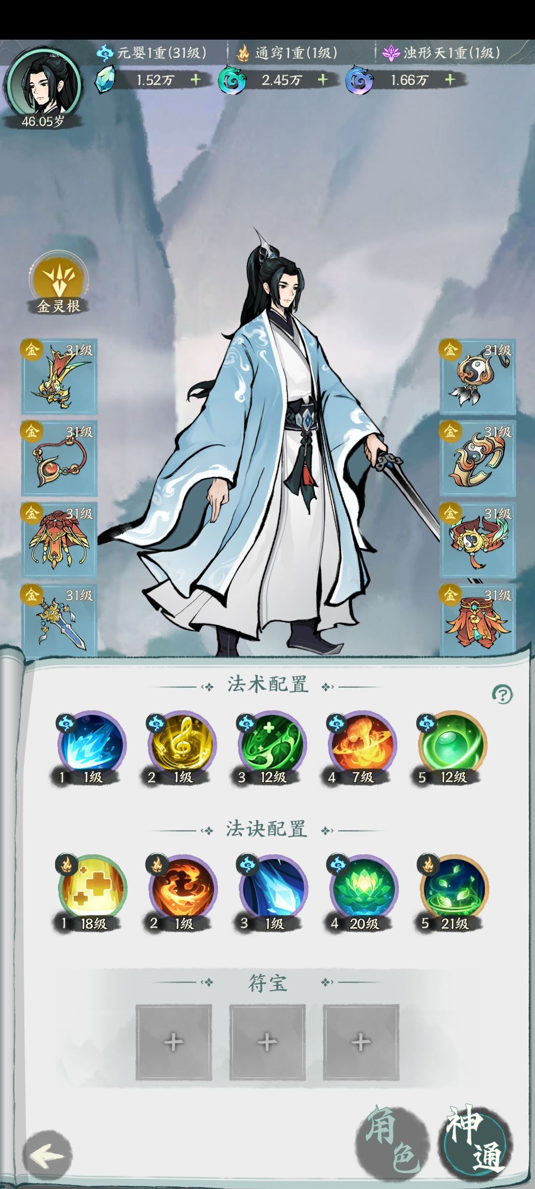 法术法决需要在神通处装备,可以通过道韵升级,但是每20级是一个槛,这个槛需要特殊道韵进行突破(即下图里的五行·道韵、本源·道韵等)