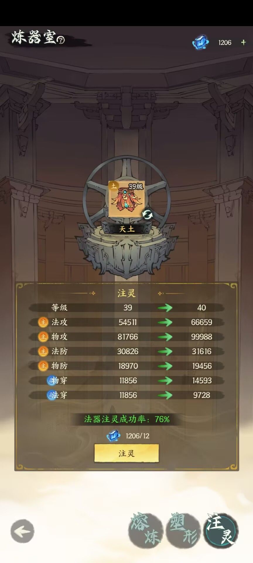 角色可穿戴十件法器,法器可在炼器室注灵升级,最高不超过人物等级(注灵材料-庚金 可分解装备获得)