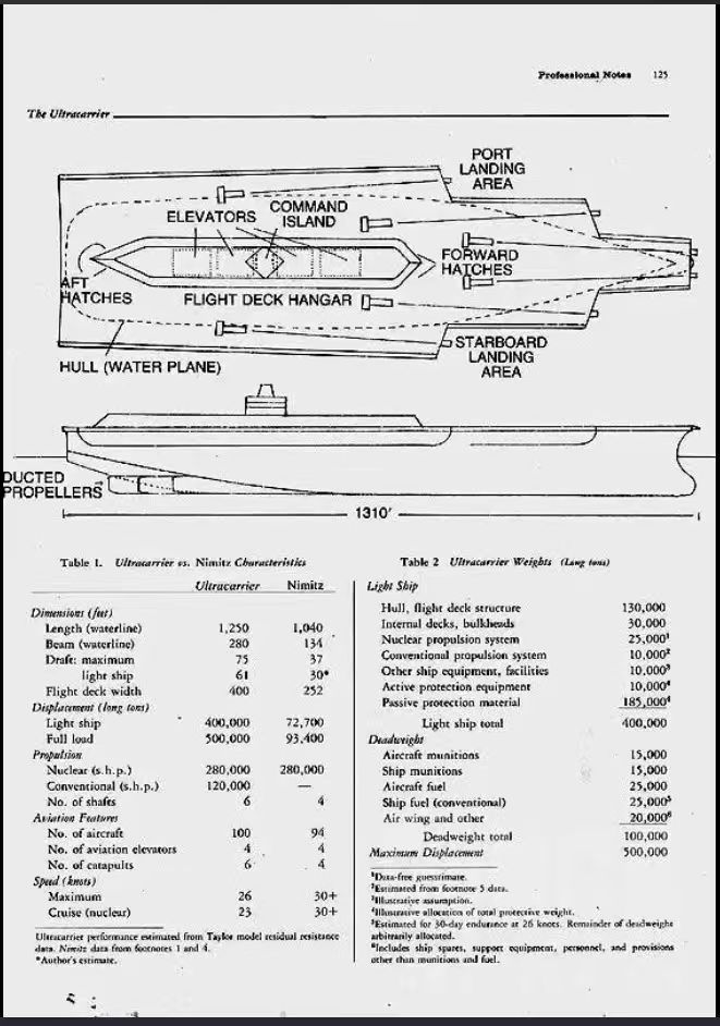 为此,此提案建议认真考虑一艘比尼米兹级大得多的航母,因为它能增强生存能力并提高成本效益。这艘航母的排水量相当于一艘超大型油轮,为简洁起见,称为超级航母 (ultracarrier)。