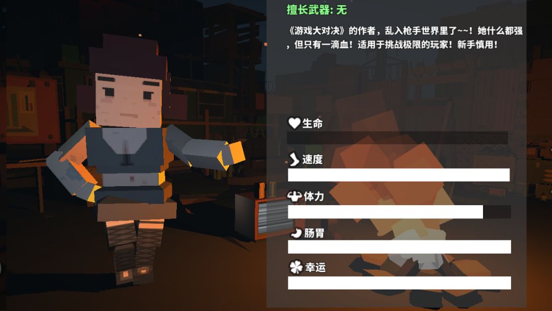 她只有一滴血,但其他属性爆炸。属于挑战型玩家使用的角色,不适合新手使用!有记录的欢迎发我喔!哈哈