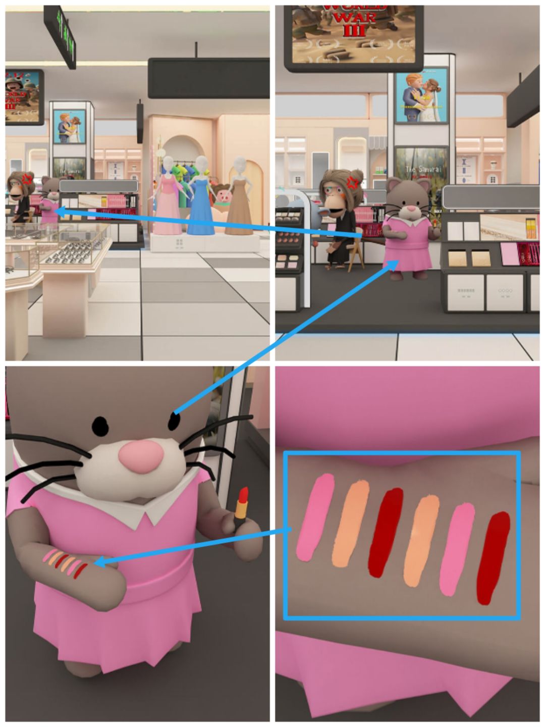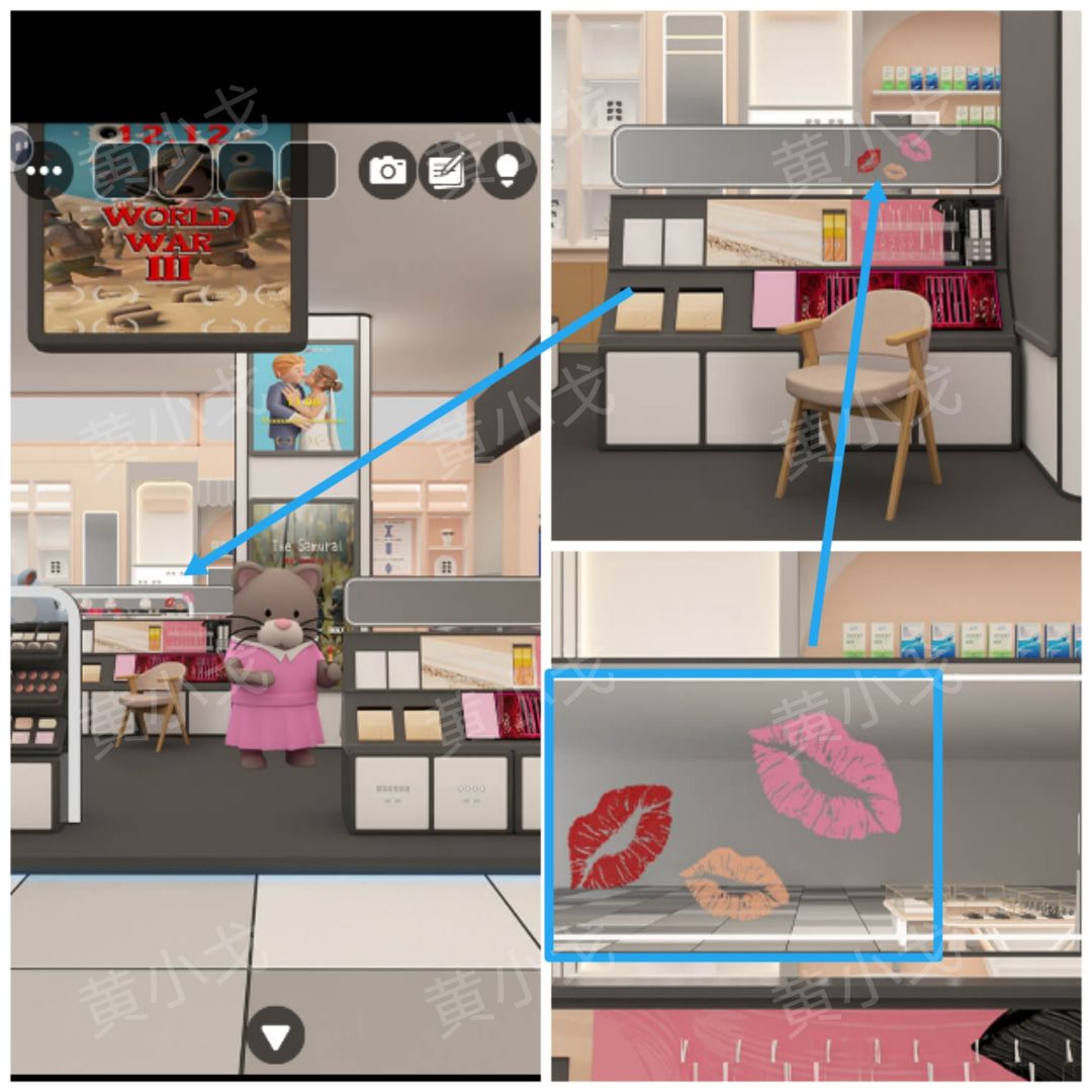 7.进入彩妆店,查看小猫手上的口号试色