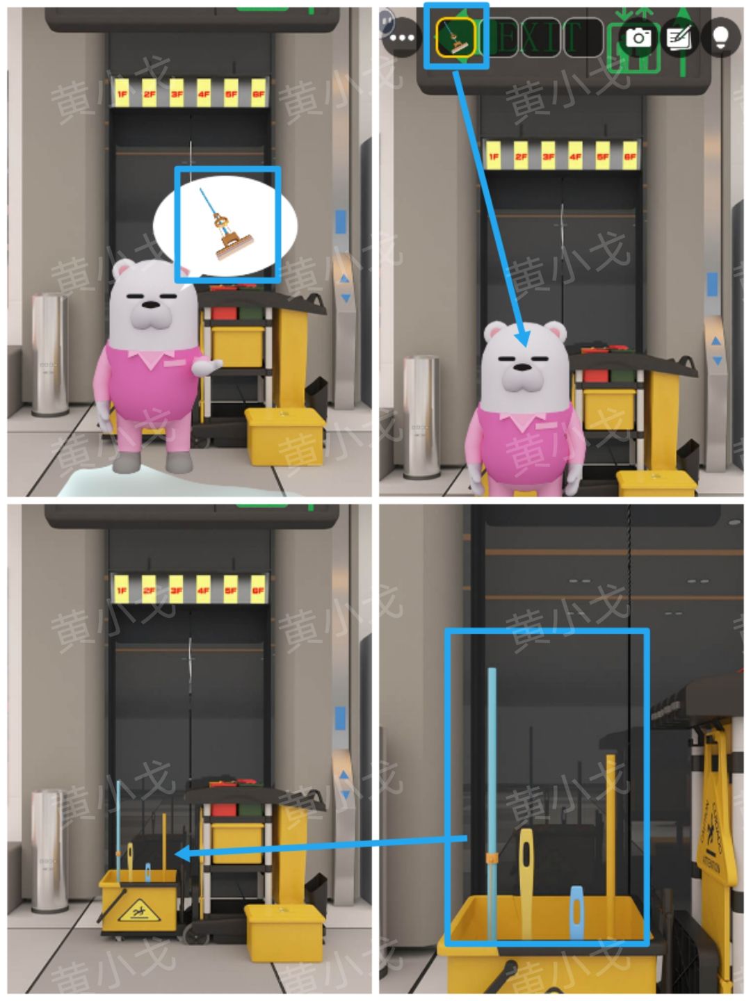 19.拿【拖把】给北极熊拖地;查看工具箱里的工具,获得线索