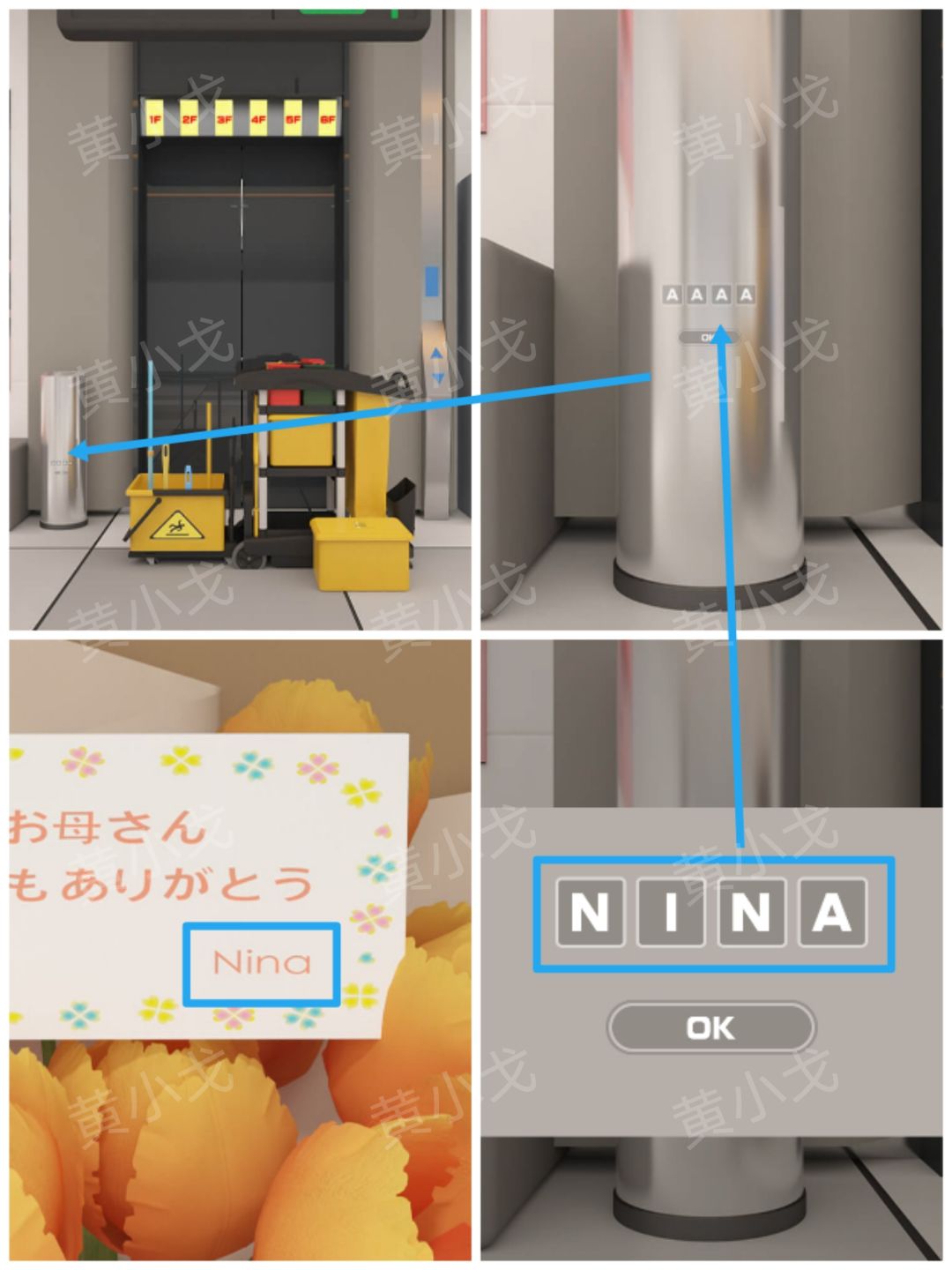 28.点击电梯旁边的垃圾桶上的密码锁,根据[休息区]花束上的卡片线索,输入密码:NINA