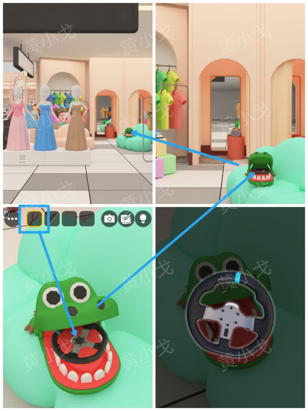 32.点击沙发上的鳄鱼玩具,用【树枝】卡住,获得【方向盘】