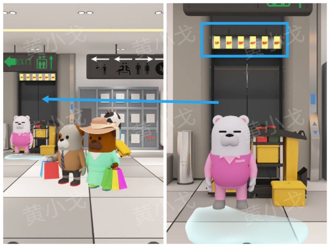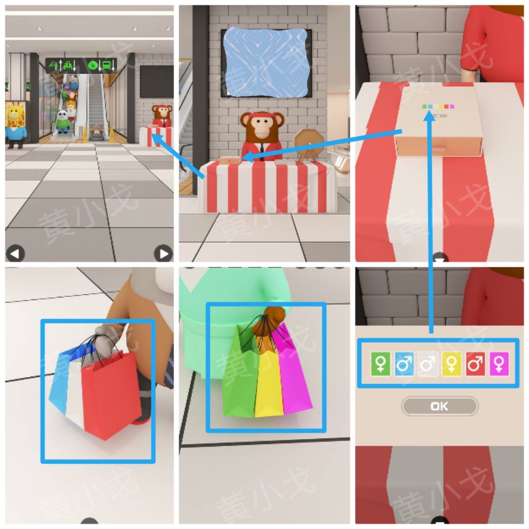 🔶[电梯]场景购物袋的颜色及客人的性别:男客人-蓝白红,女客人-绿黄紫