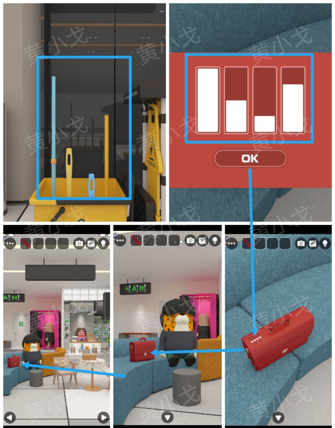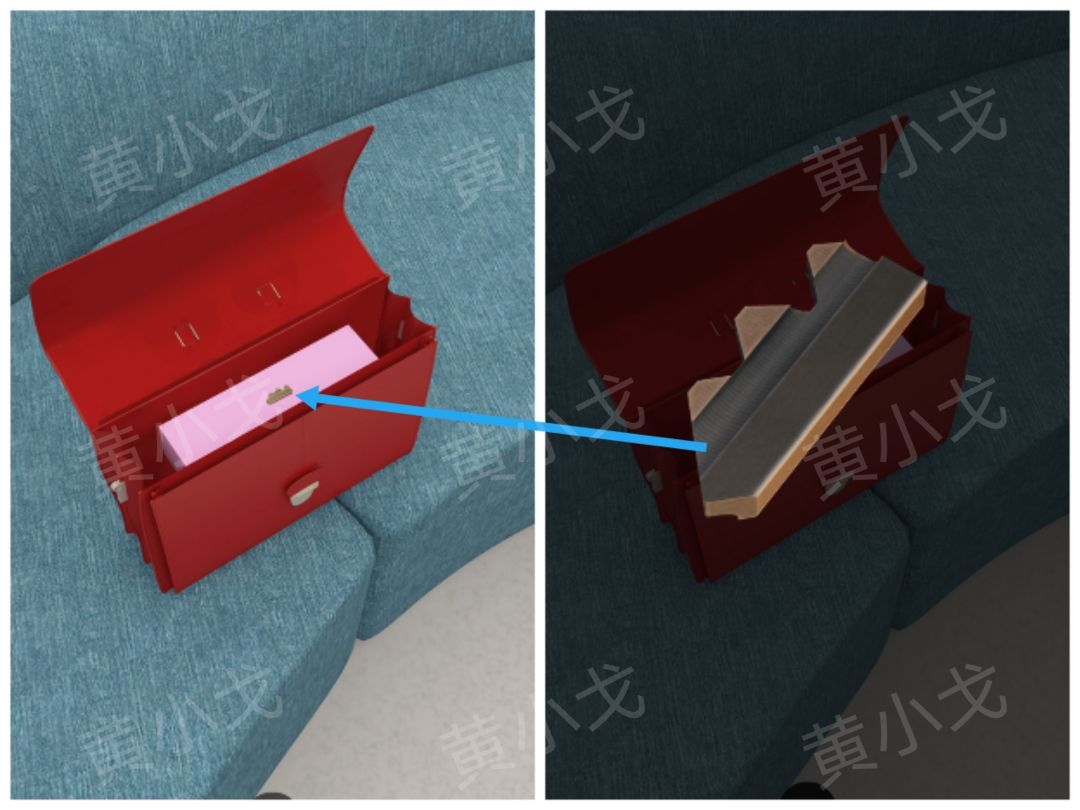 24.点击沙发上的公文包,根据[电梯]场景工具箱中的工具高度线索,调整密码锁
