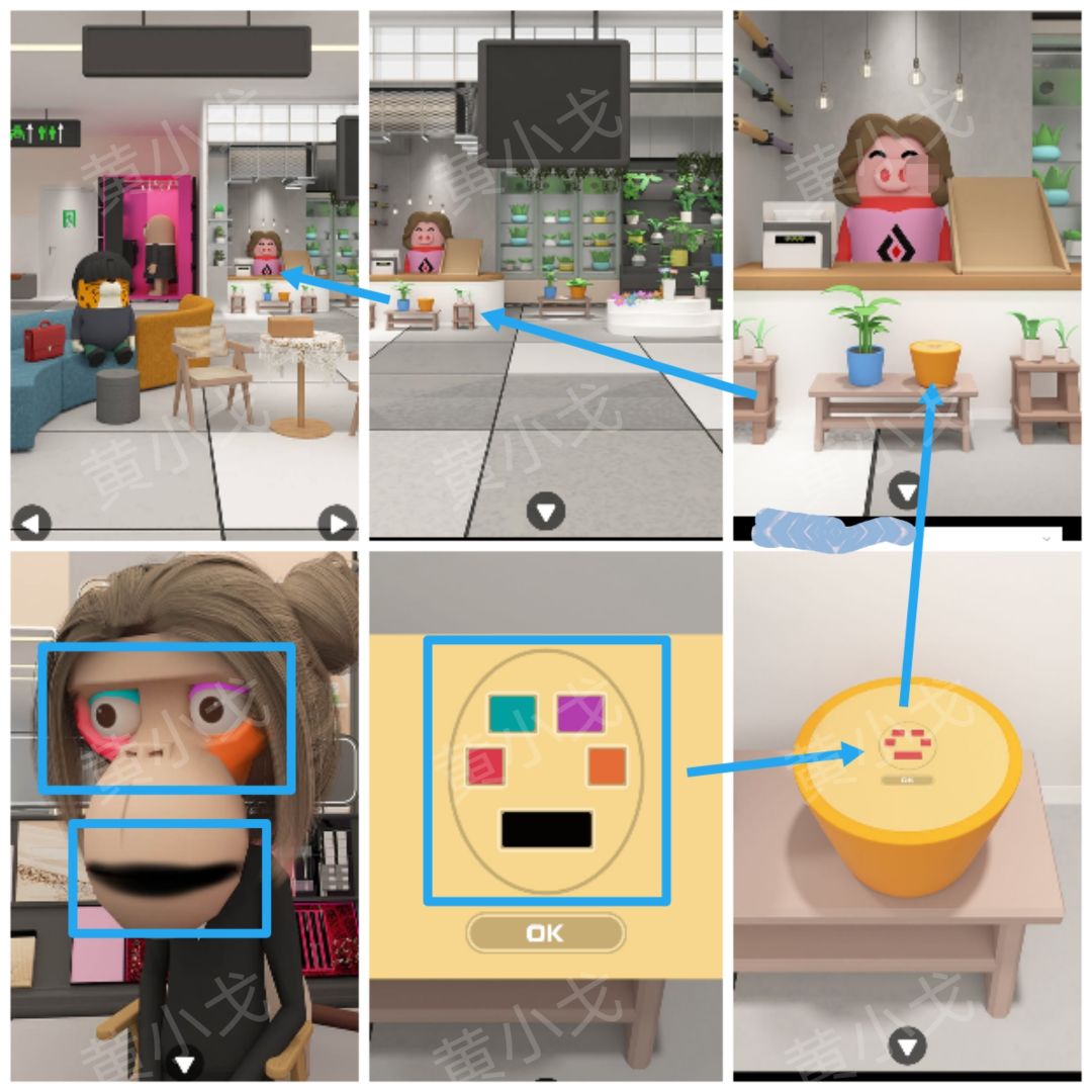 13.点击花店收银台前面的凳子上的黄色桶,根据[彩妆区]猴子的眼妆和唇妆线索,调整密码锁