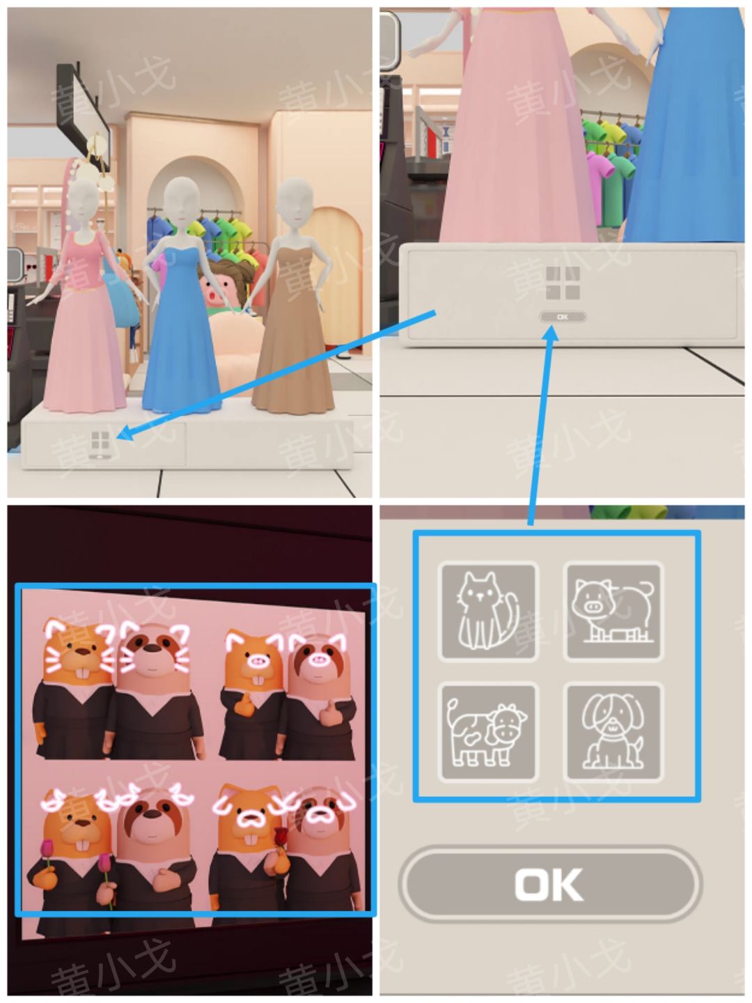 🔷左上-猫、右上-猪、左下-牛、右下-狗