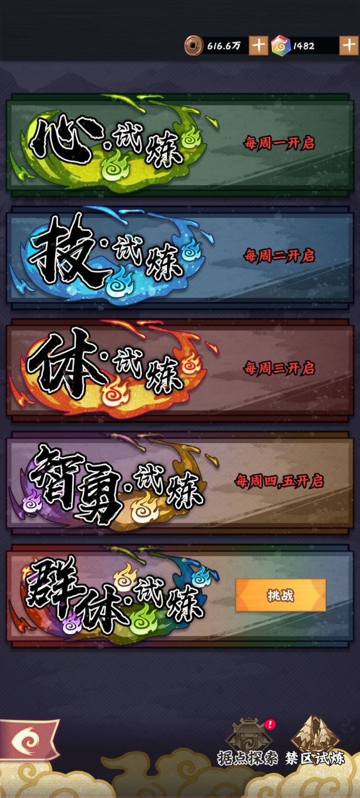 开服第10天,玩家50级,且有一个金1(16星)忍者开通功能-专属和禁区试炼。