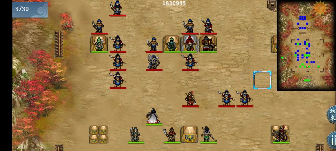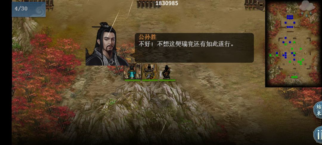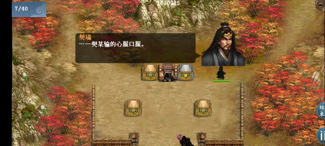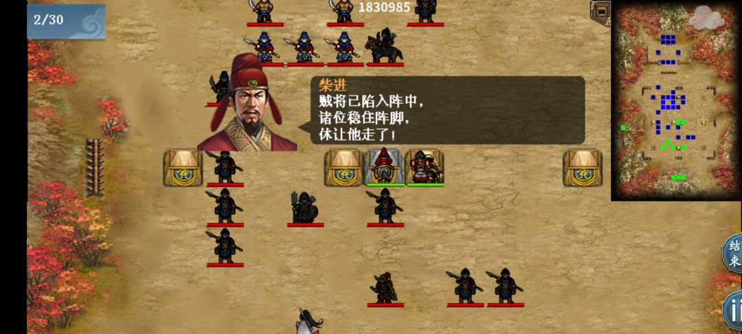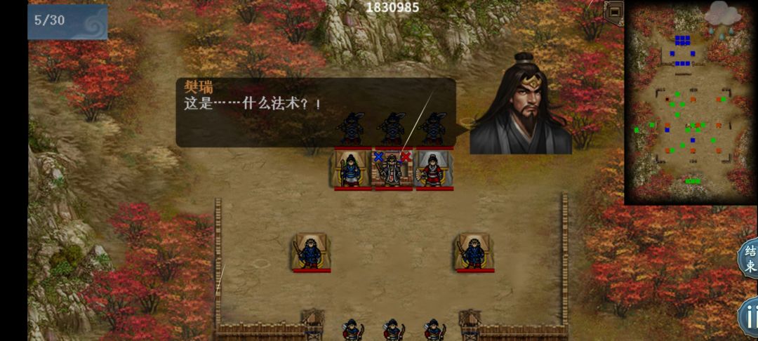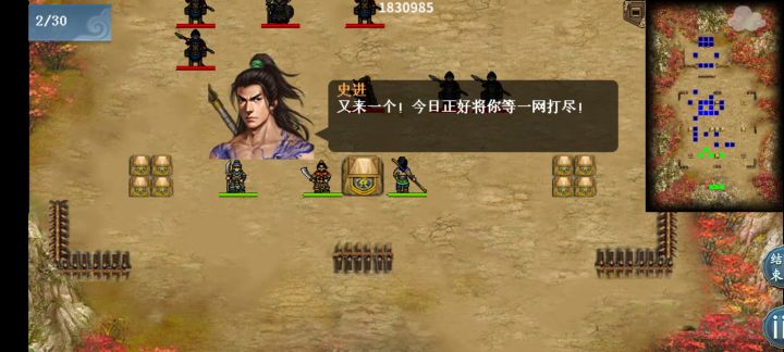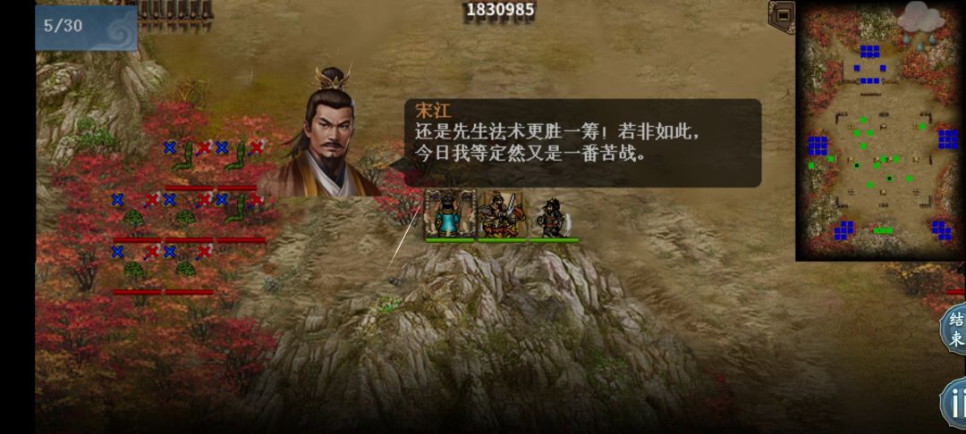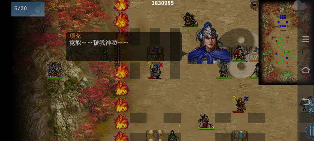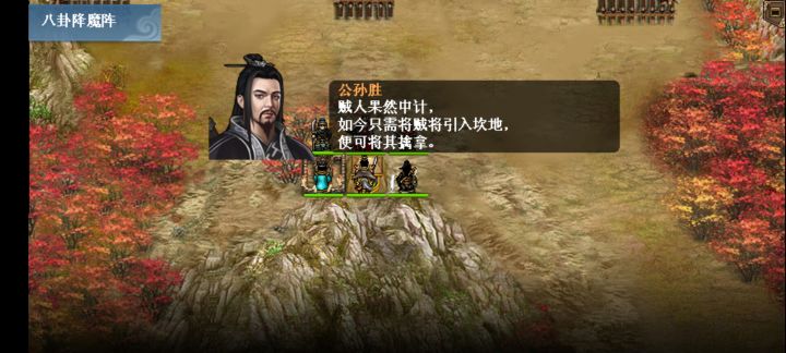开局对话一阵,宋吴公三个是不能动的,主角杨春陈达引李衮项充到下方空位置,第2回合三个尽量往下走,敌方行动我们队伍出现,项充李衮这时是无敌打不死的,项充施法降我方攻击防御buff,黄信可以用技能定住项充,我们要迅速清兵只剩10左右人时触发公孙胜剧情,请把旗子放入对应位置上(点旗子有名称的)怕错就先存个档,放对位置有提示的,有的旗子一步不能到请注意避开敌军,全部就位触发剧情,之后击退李衮项充又触发剧情,出现五队敌军清完就过关了