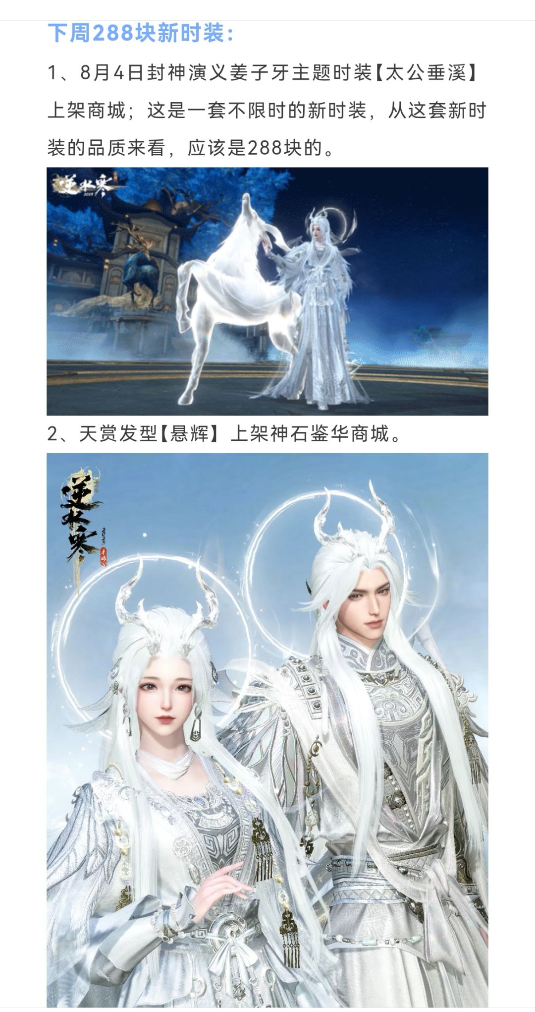 逆水寒下周一288块新时装+半价券,罗彩签双倍,新天赏发型【悬辉】,周课点奖励提升,商城新增绮珍秘宝