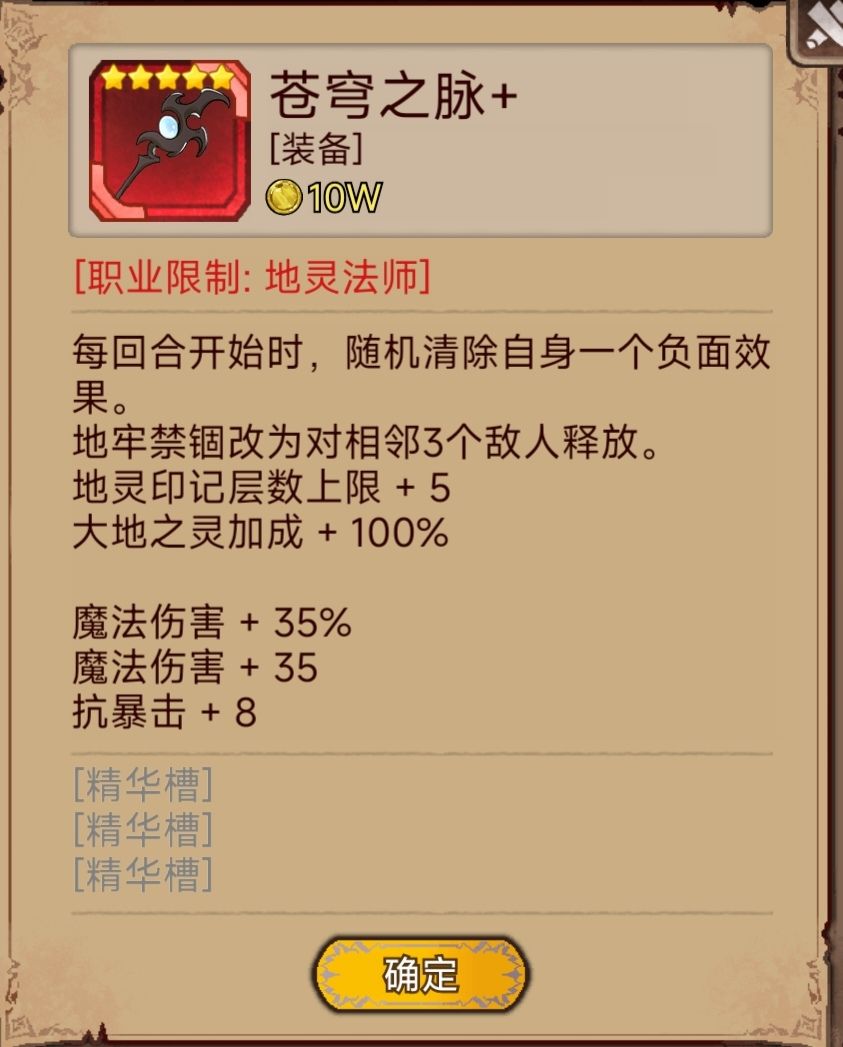 土法师就是专属,星辰仗,其他装备,如果有大法师之帽,那么给土法师打上心若止水就是完美了。(我没有,所以我给土法师的装备是双防御加法术攻击13点,能达到37的物理防御,加上隐匿特质,挂机上百次,死过一次,土法师可以提前打上攻其不备特质,让随机的连发机枪变为连狙,打boss的时候会很爽的!!