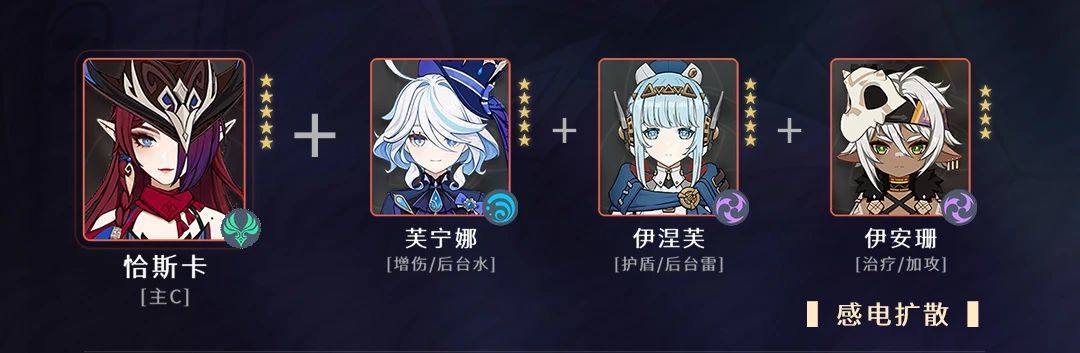 6.3感电扩散推荐理由【伊涅芙】:提供护盾,让感电转为月感电,后台雷,后台伤害【芙宁娜】:全队增伤,后台伤害【伊安珊】:治疗,增加前台攻击力