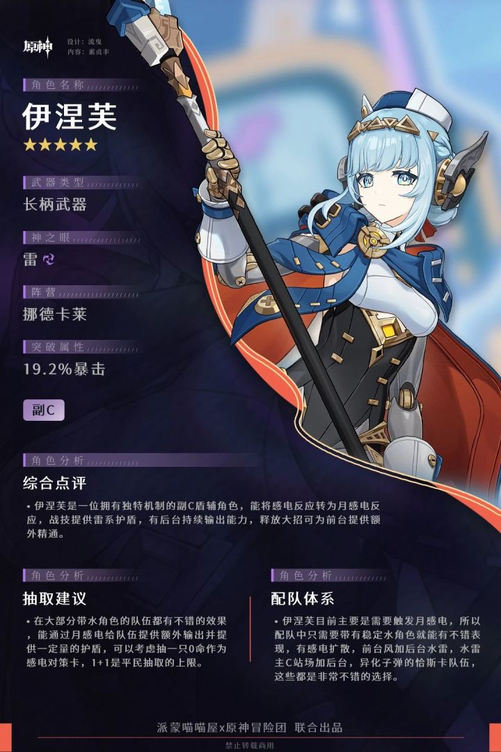 总结伊涅芙作为月反应体系的第一位角色,通过将感电转换为月感电,大幅提升原本可以极不稳定的感电伤害,而且因为月感电的衰减机制,不需要前台角色堆精通,完全不影响前台角色本身的输出能力,相当于在不影响角色本身输出的情况下提供了一部分的额外输出伊涅芙是一个非常不错的对策卡,有不错的后台副C能力,未来对于感电C也有非常不错的拐力,适合抽一个当作对策卡使用,对于老角色有非常大提升。