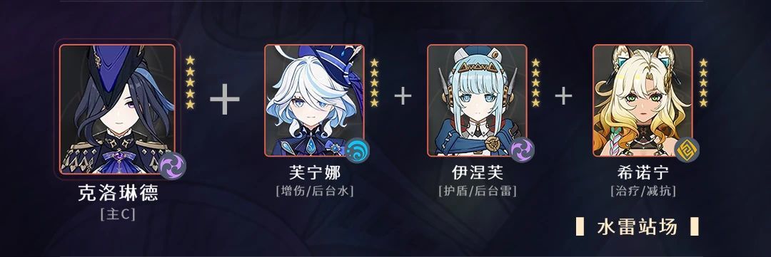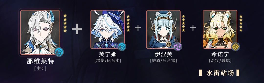 6.2水雷站场推荐理由【伊涅芙】:提供护盾,让感电转为月感电,后台雷,后台伤害【芙宁娜】:全队增伤,后台伤害【希诺宁】:治疗,减抗