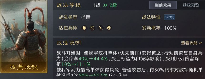 披坚执锐能让一个前排拥有兵刃减伤和回复的战法,这个战法打七级地前特别好用,因为七级地之前的守军都是以兵刃伤害为主。