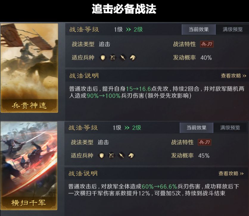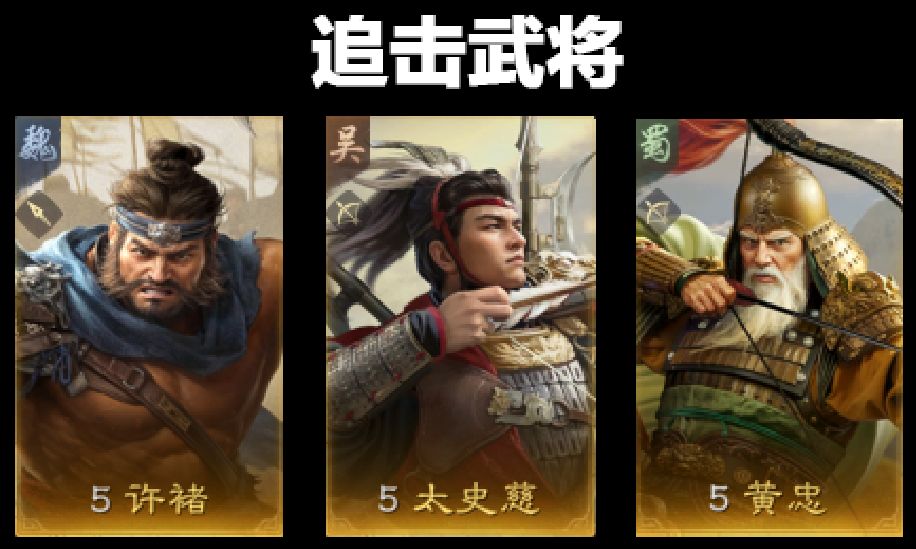 后排想玩追击武将,像是许褚、太史慈、黄忠,那么必须拥有两个高伤害的金色战法才行,兵贵神速和横扫千军,没有的话就不要考虑追击了。