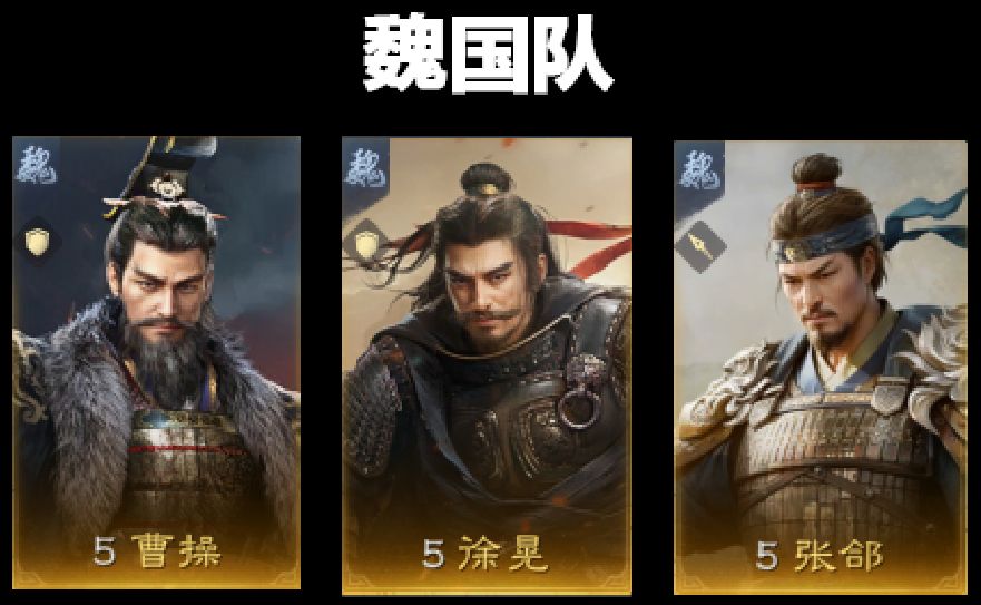 三皇的曹操搭配阵容和刘备同理,曹操、徐晃、张郃组建魏国国家队。