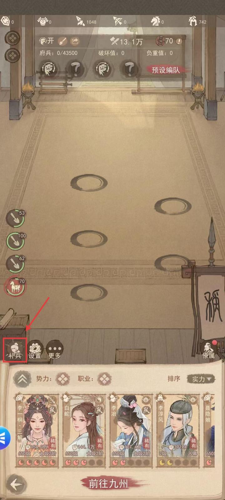 4、在僚属10星以前,基本不用担心僚属搭配问题,哪个僚属星级高就用哪个,不用管配不配。戎车页面有个补兵的按钮,点一下系统也会自动补兵,在不懂搭配的时候,用系统配兵就很好。