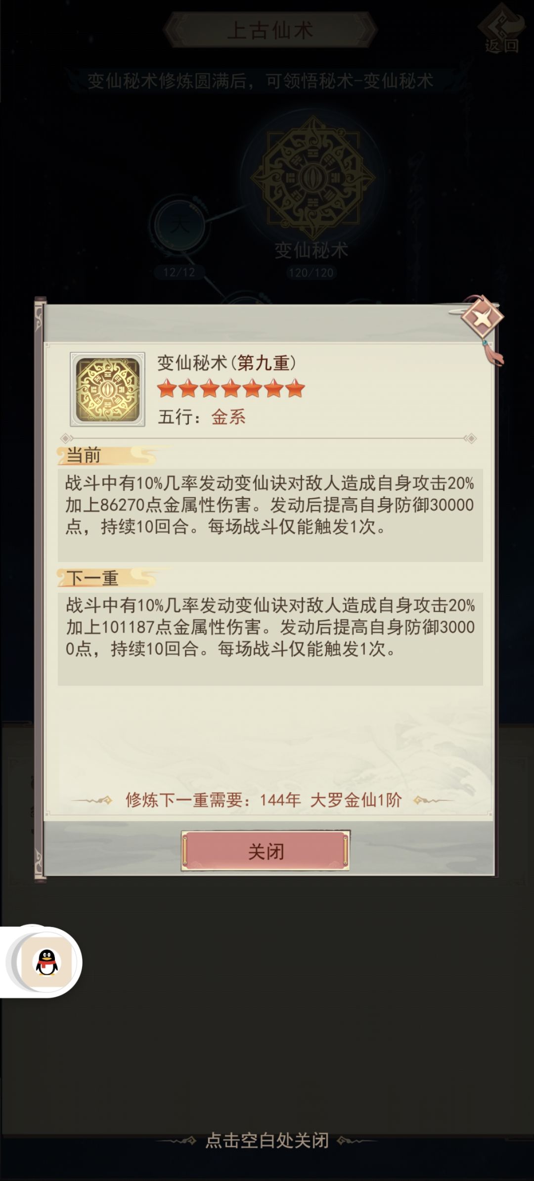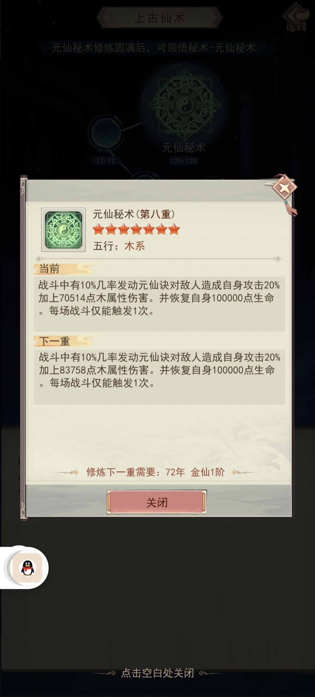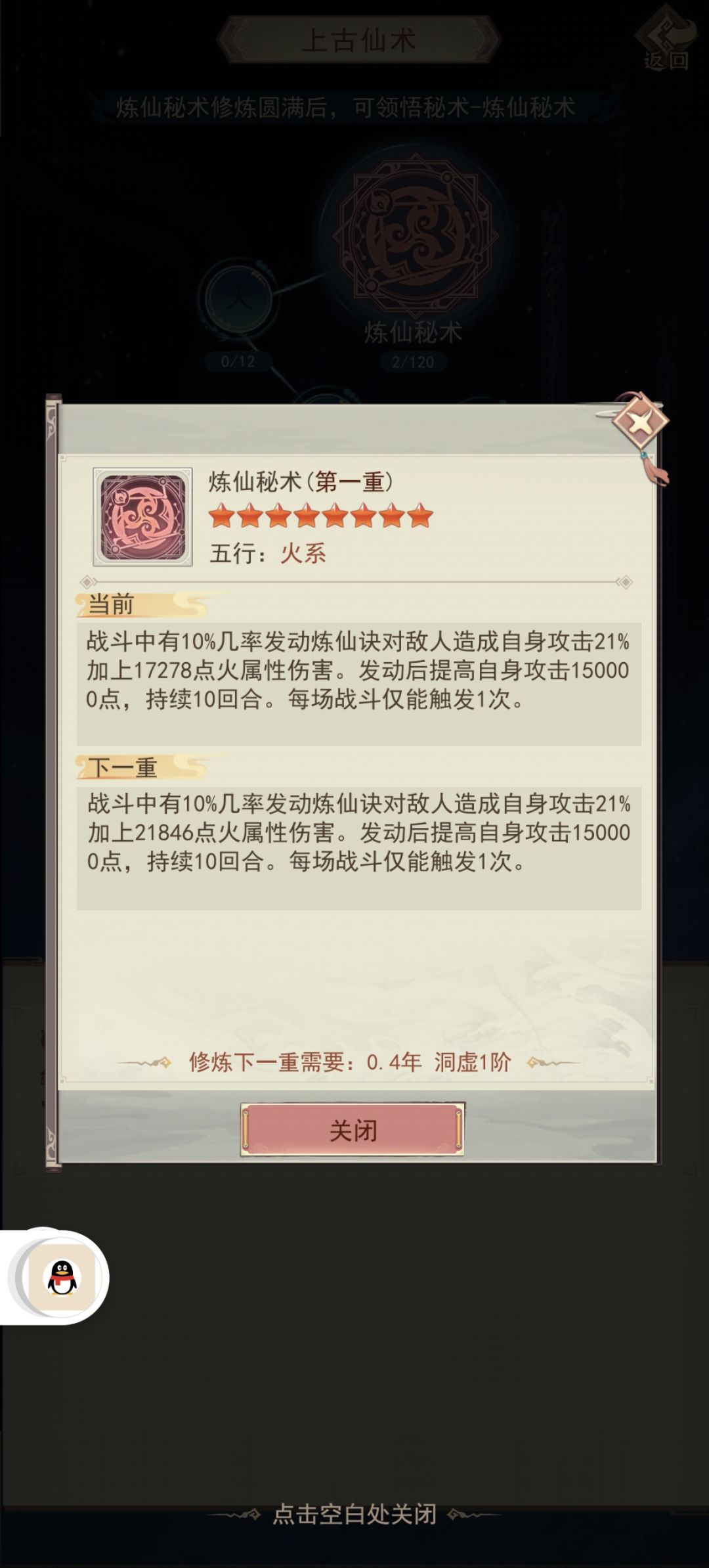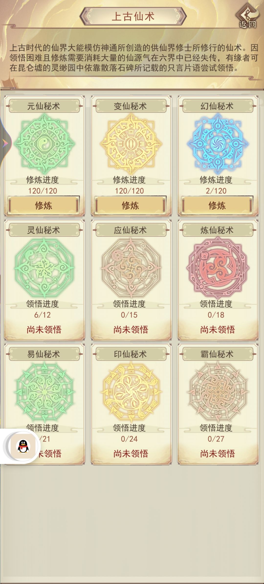 【秘术升级】:第一层探索齐悟道碑,可以学习第一个秘术,一次升级需要50仙气、5000灵石。