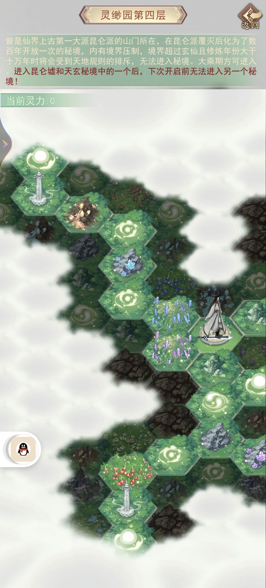 走一步会消耗2点灵力,因此我们一天可以走10格,而我们的核心目标是悟道碑,分布在地图都左上,右边,和左下(地图可以滑动),最短路径都是6格,因此寻找石碑固定要消耗36点灵力,剩下的24点灵力就可以自由探索了。