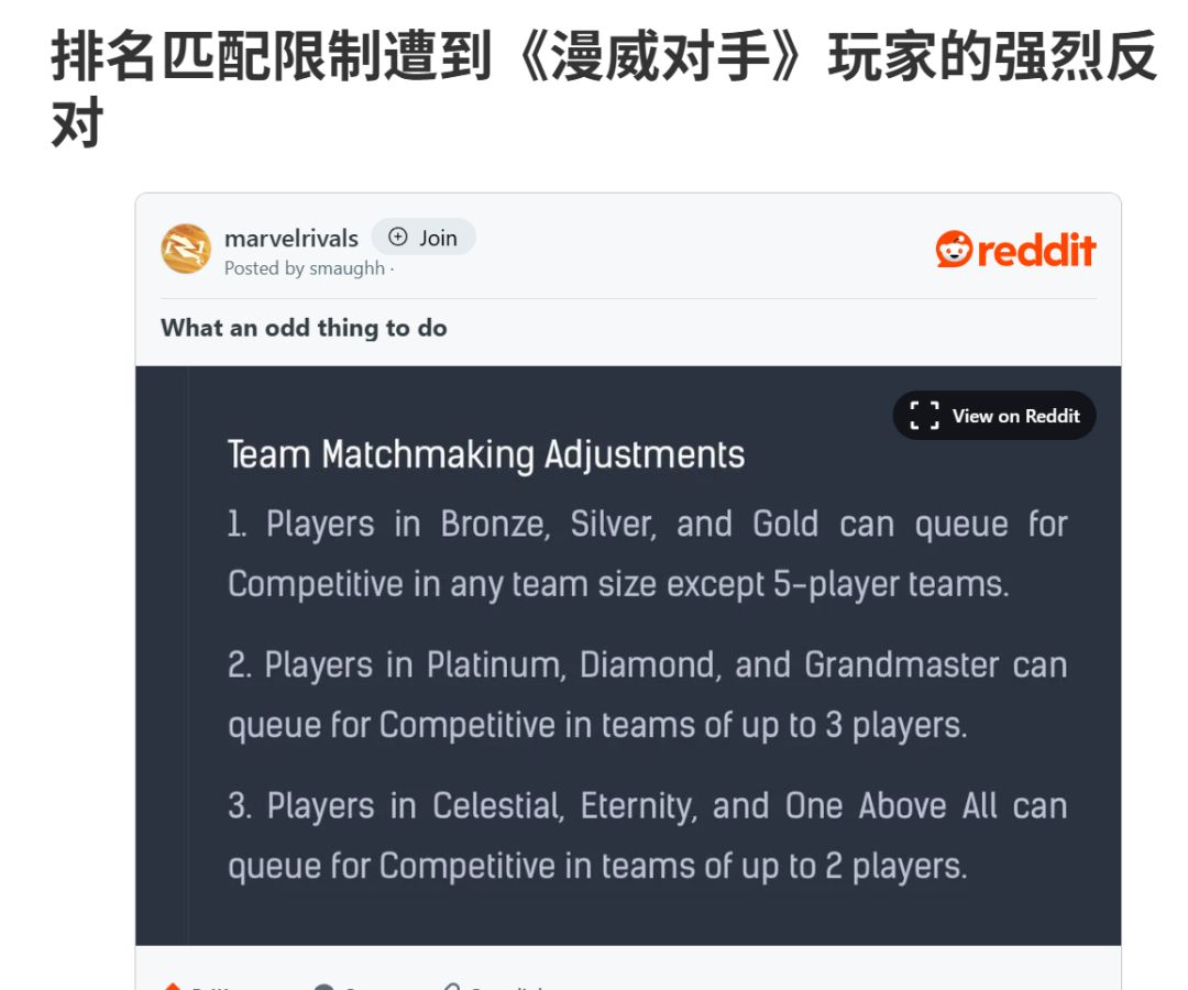 Marvel Rivals 社区对即将推出的排位赛匹配限制反应负面,该限制禁止白金及以上等级的玩家以五人小队模式进行游戏。在游戏的 Reddit 子版块,用户 smaughh 称这项调整“很奇怪”,并认为这是阻止玩家与“大批玩家”对战的正确方式。超过 900 条评论中,许多人表示难过,因为他们之前曾与好友组队玩 Marvel Rivals ,而这项改变将使这种情况变得更加困难。另一些人则认为,这可能会增加小号账户的数量,从而允许 Marvel Rivals 玩家以小队模式进行排位赛