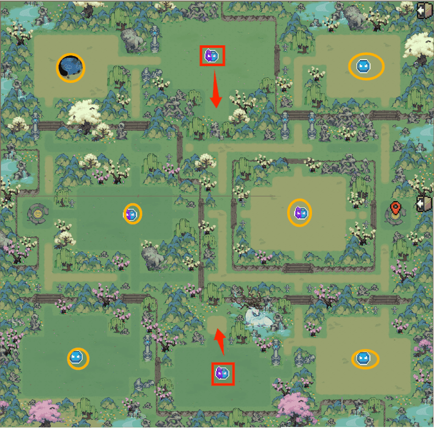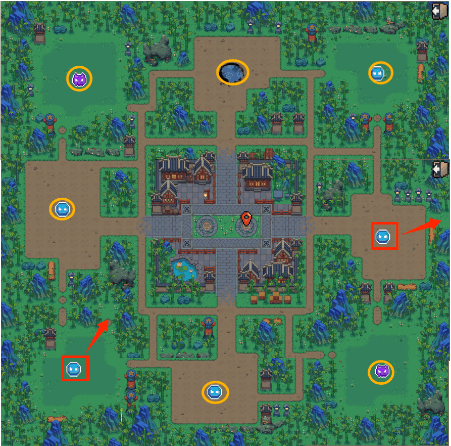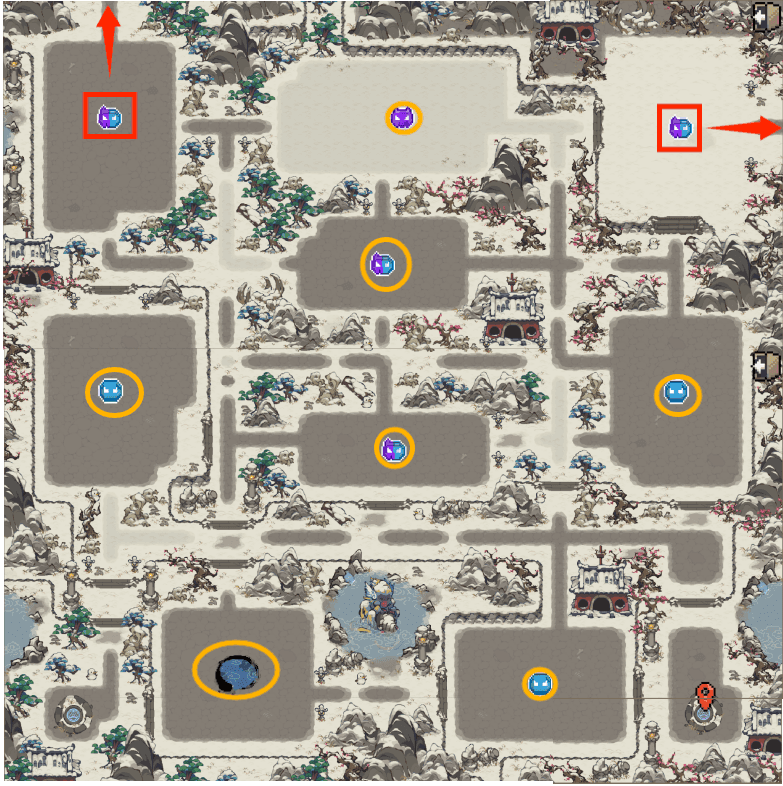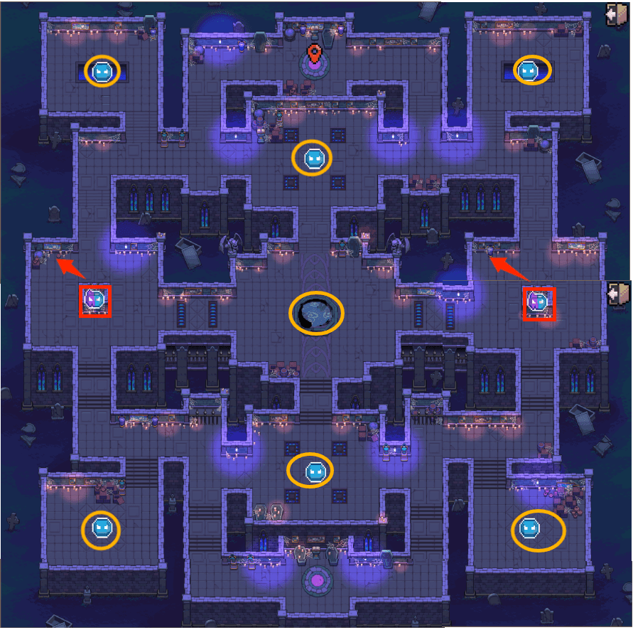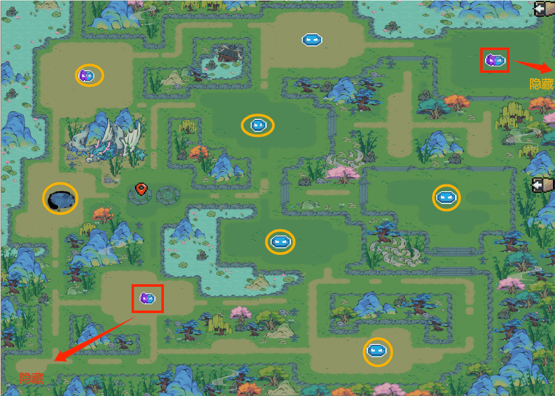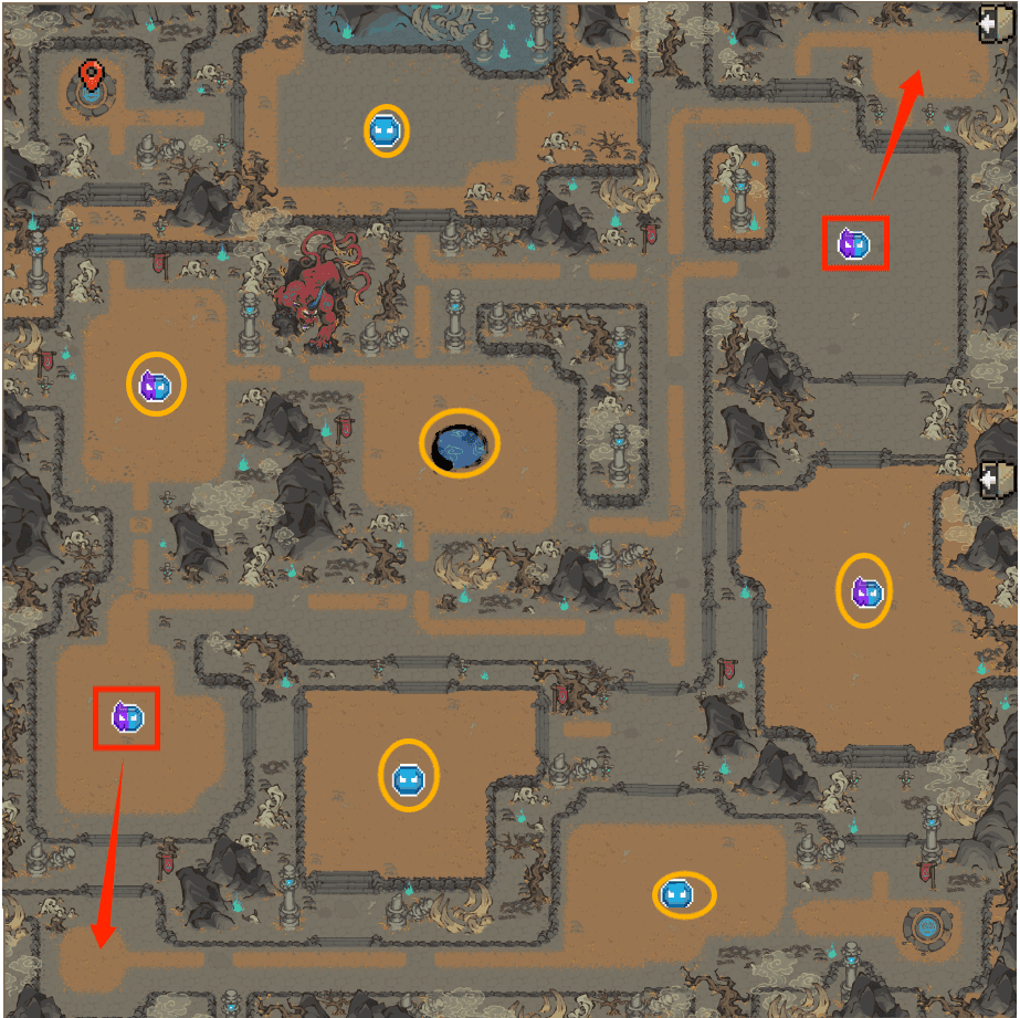 箭头指向为隐藏房间,清除 方框 中的怪即可开启隐藏房间