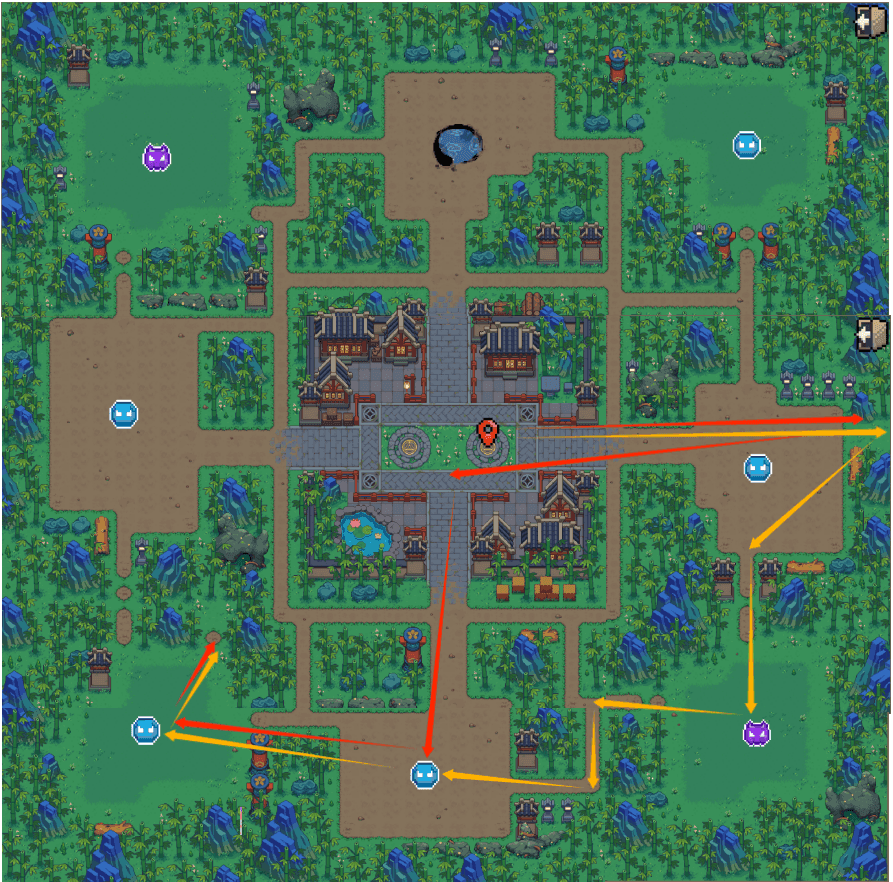 红色箭头路线为100分 橙色箭头路线为130分(实际上能打140分,最后一个隐藏进去尽量一次性秒光)