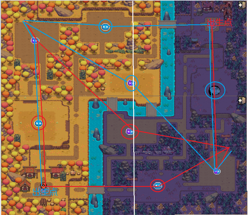 蓝色出生点只会刷新蓝色圆圈框出的地方。
