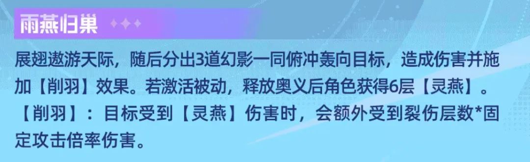 然后第一技能大招则是输出+获取6层“灵燕”的效果,且还能施加一个按照对方的“裂伤”层数来额外出伤的“削羽”效果。